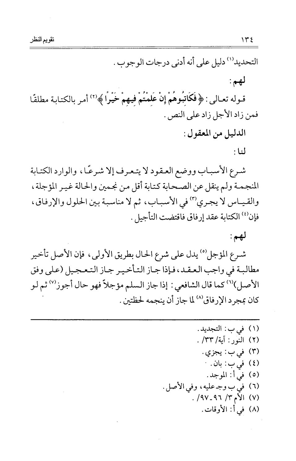 شرع الْمُؤَجل يدل على شرع الْحَال بطرِيق الأولى، فَإِن الأَصْل تَأْخِير مُطَالبَة فِي وَاجِب العقد، فَإِذا جَازَ التَّأْخِير جَازَ التَّعْجِيل (على وفْق الأَصْل) كَمَا قَالَ الشَّافِعِي: إِذا جَازَ السّلم مُؤَجّلا فَهُوَ حَال أجوز ثمَّ لَو كَانَ بِمُجَرَّد الإرفاق لما جَازَ أَن ينجمه لحظتين.
