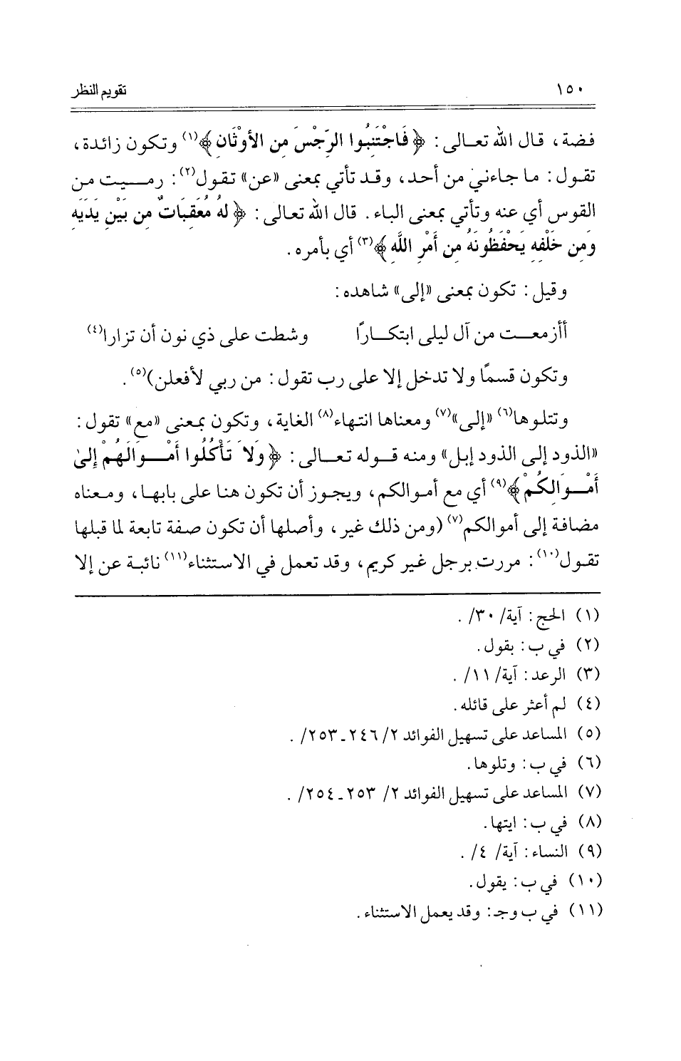 وتتلوها " إِلَى " وَمَعْنَاهَا انْتِهَاء الْغَايَة، وَتَكون بِمَعْنى " مَعَ " تَقول: " الذود إِلَى الذود إبل " وَمِنْه قَوْله تَعَالَى: {وَلَا تَأْكُلُوا أَمْوَالهم إِلَى أَمْوَالكُم} أَي مَعَ أَمْوَالكُم، وَيجوز أَن تكون هُنَا على بَابهَا، وَمَعْنَاهُ مُضَافَة إِلَى أَمْوَالكُم (وَمن ذَلِك غير، وَأَصلهَا أَن تكون صفة تَابِعَة لما قبلهَا تَقول: مَرَرْت بِرَجُل غير كريم، وَقد تعْمل فِي الِاسْتِثْنَاء نائبة عَن إِلَّا
