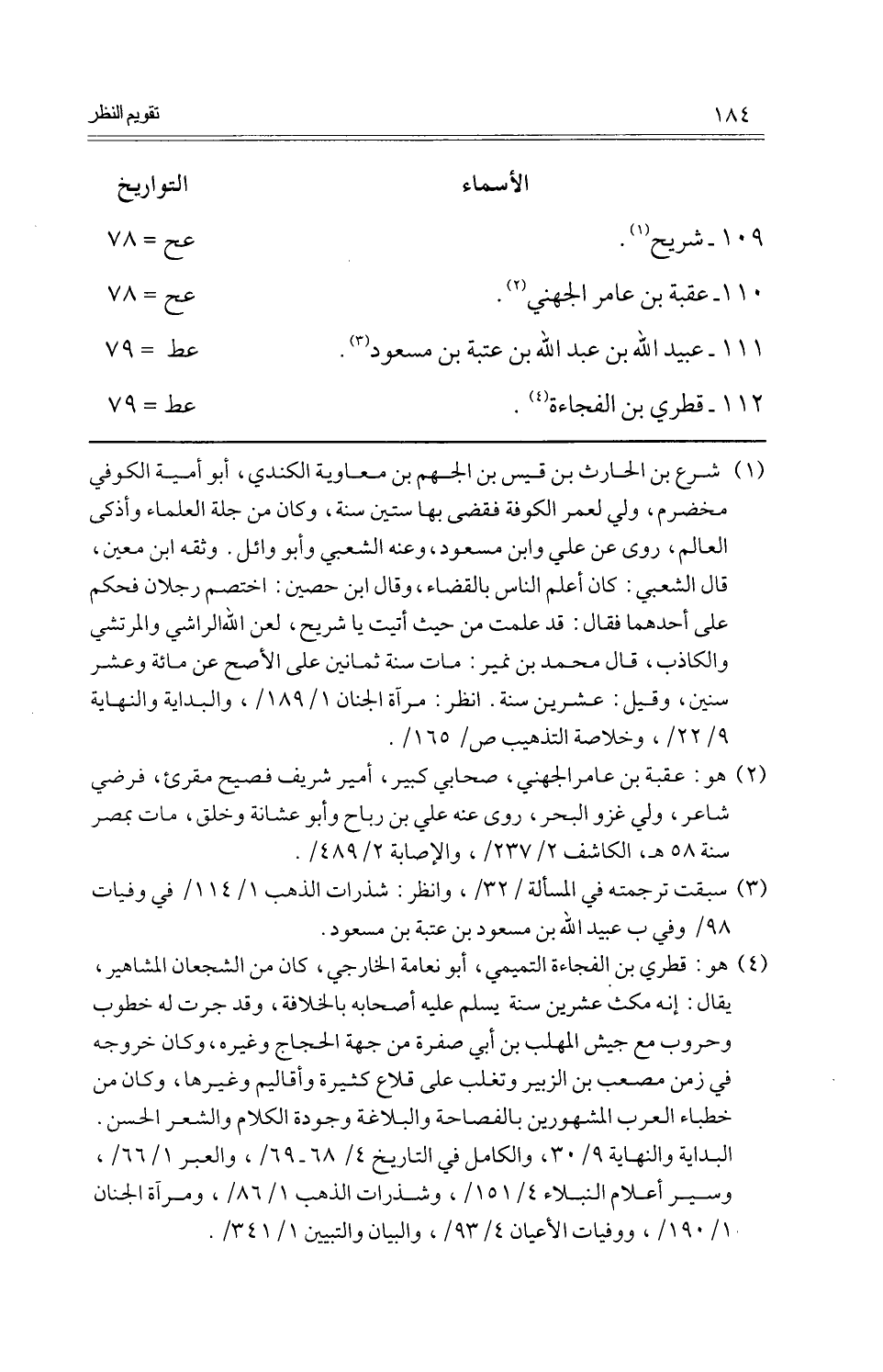 109 - شُرَيْح.، عح = 78 110 - عقبَة بن عَامر الْجُهَنِيّ.، عح = 78 111 - عبيد اللَّهِ بن عبد اللَّهِ بن عتبَة بن مَسْعُود.، عط = 79 112 - قطري بن الْفُجَاءَة.، عط = 79