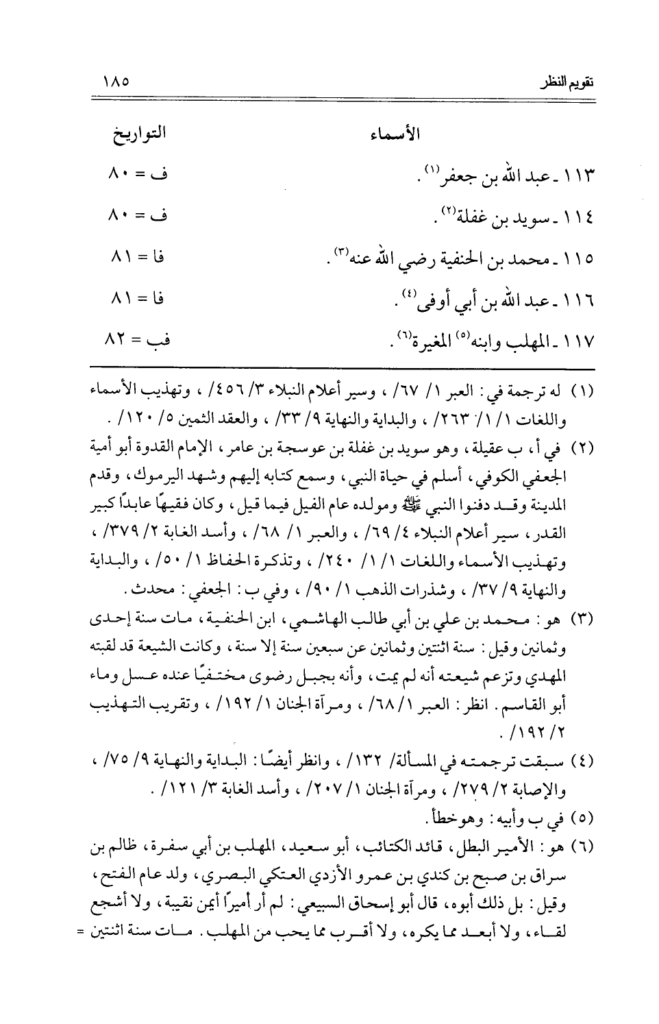 113 - عبد اللَّهِ بن جَعْفَر.، ف = 80 114 - سُوَيْد بن غَفلَة.، ف = 80 115 - مُحَمَّد بن الْحَنَفِيَّة رَضِي اللَّهِ عَنهُ.، فا = 81 116 - عبد اللَّهِ بن أبي أوفى.، فا = 81 117 - الْمُهلب وَابْنه الْمُغيرَة.، فب = 82