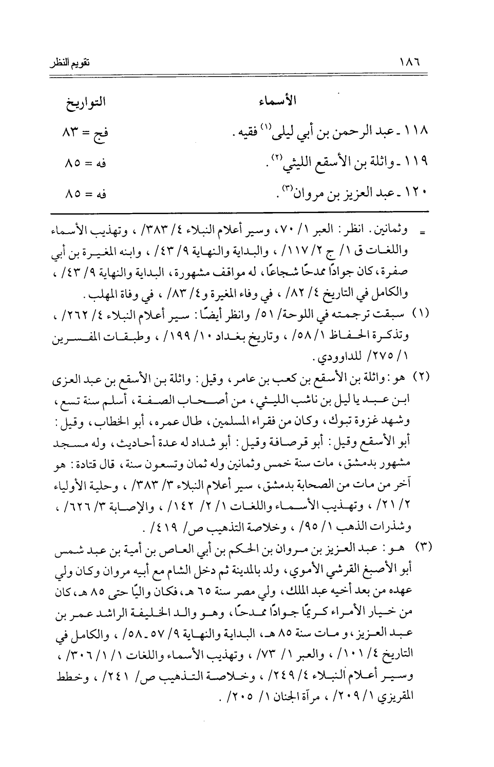 118 - عبد الرَّحْمَن بن أبي ليلى فَقِيه.، فج = 83 119 - وَاثِلَة بن الْأَسْقَع اللَّيْثِيّ.، فه = 85 120 - عبد الْعَزِيز بن مَرْوَان.، فه = 85