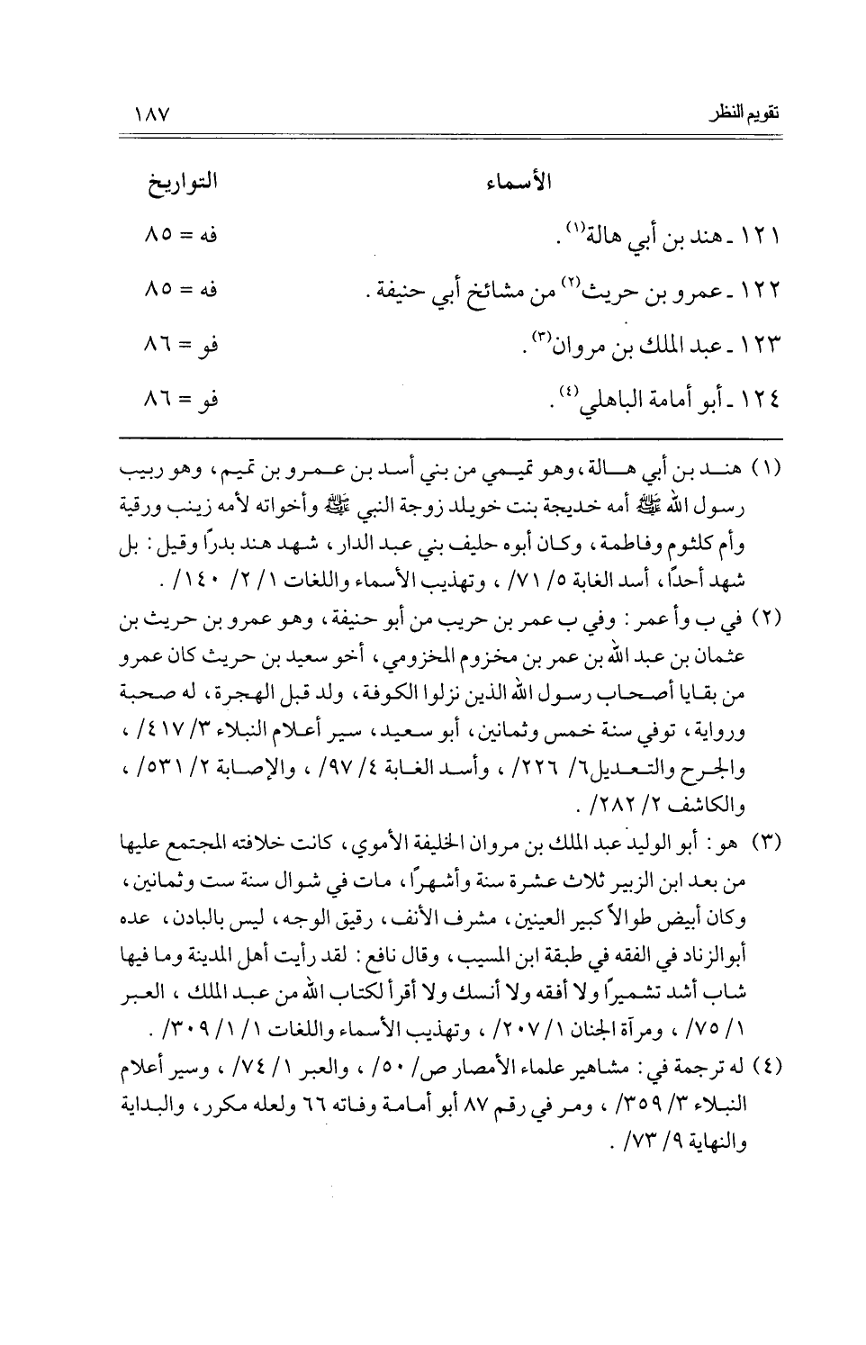 121 - هِنْد بن أبي هَالة.، فه = 85 122 - عَمْرو بن حُرَيْث من مشائخ أبي حنيفَة.، فه = 85 123 - عبد الْملك بن مَرْوَان.، فو = 86. 124 - أَبُو أُمَامَة الْبَاهِلِيّ.، فو = 86