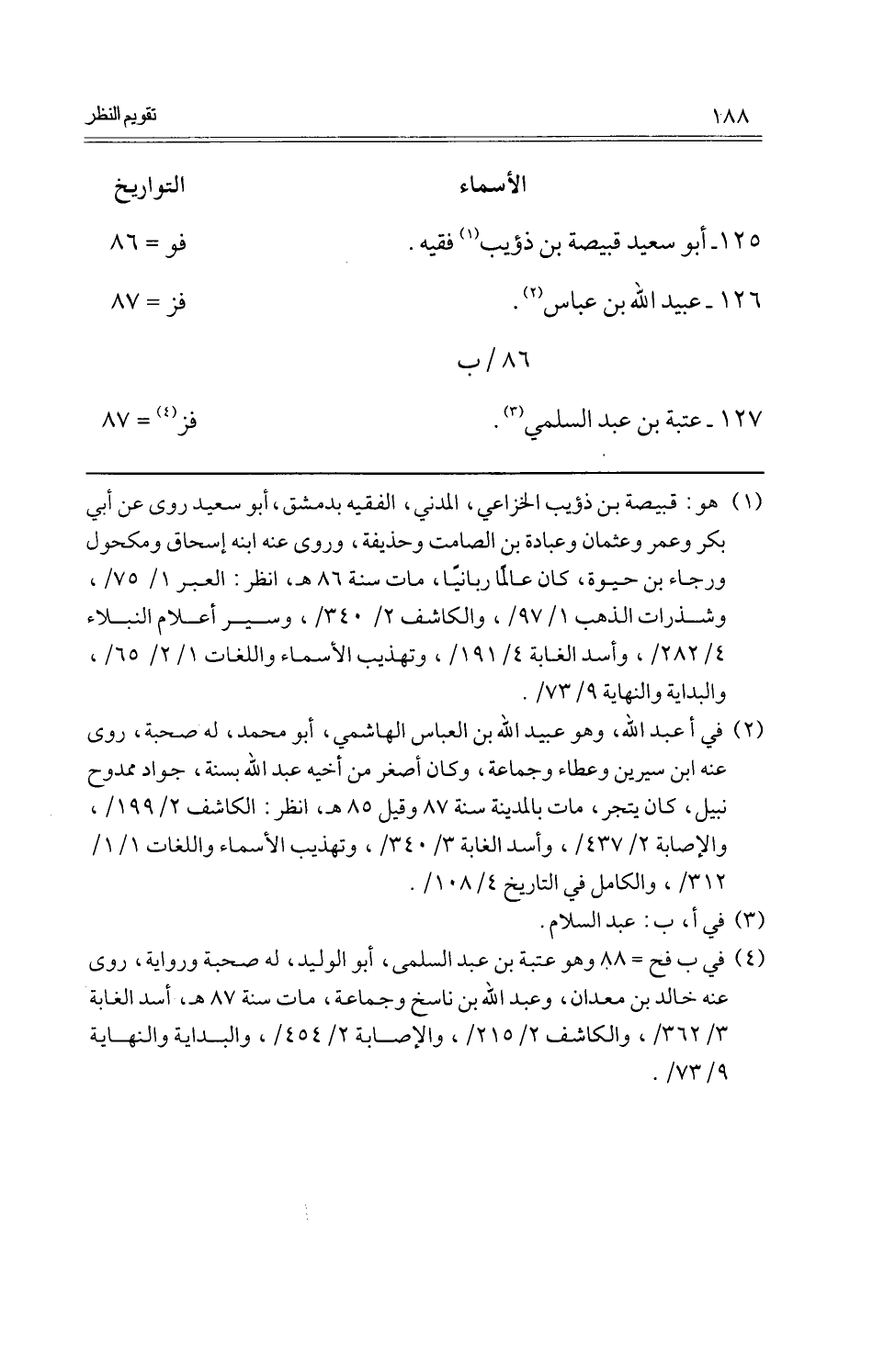 125 - أَبُو سعيد قبيصَة بن ذُؤَيْب فَقِيه.، فو = 86 126 - عبيد اللَّهِ بن عَبَّاس.، فز = 87 86 / ب 127 - عتبَة بن عبد السّلمِيّ.، فز = 87