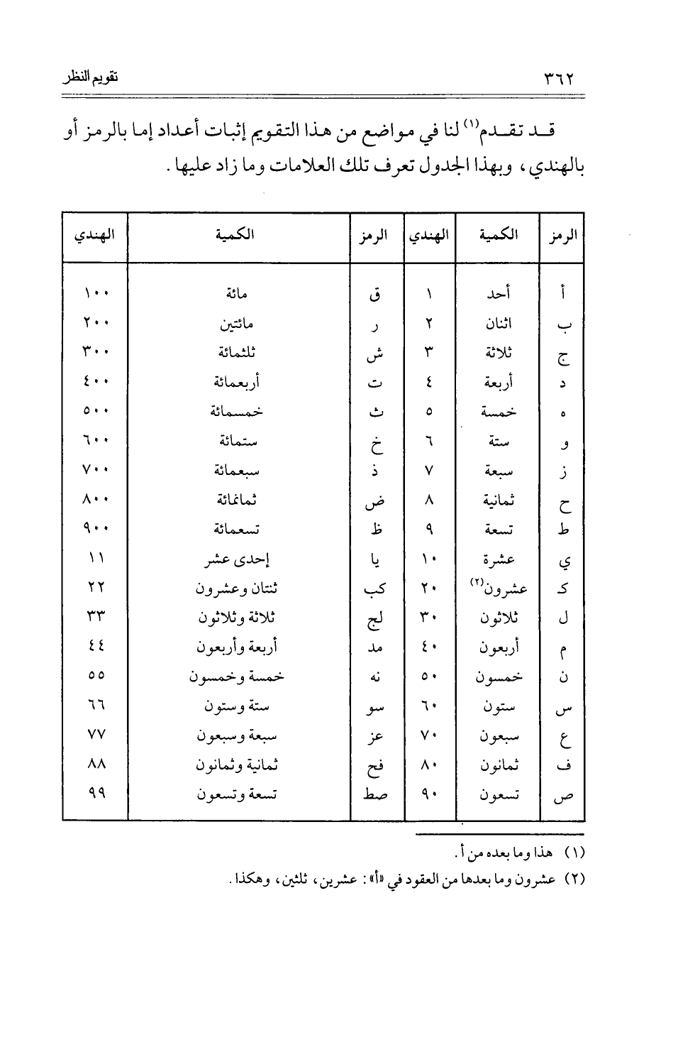 قد تقدم لنا فِي مَوَاضِع من هَذَا التَّقْوِيم إِثْبَات أعداد إِمَّا بالرمز أَو بالهندي، وَبِهَذَا الْجَدْوَل تعرف تِلْكَ العلامات وَمَا زَاد عَلَيْهَا.
