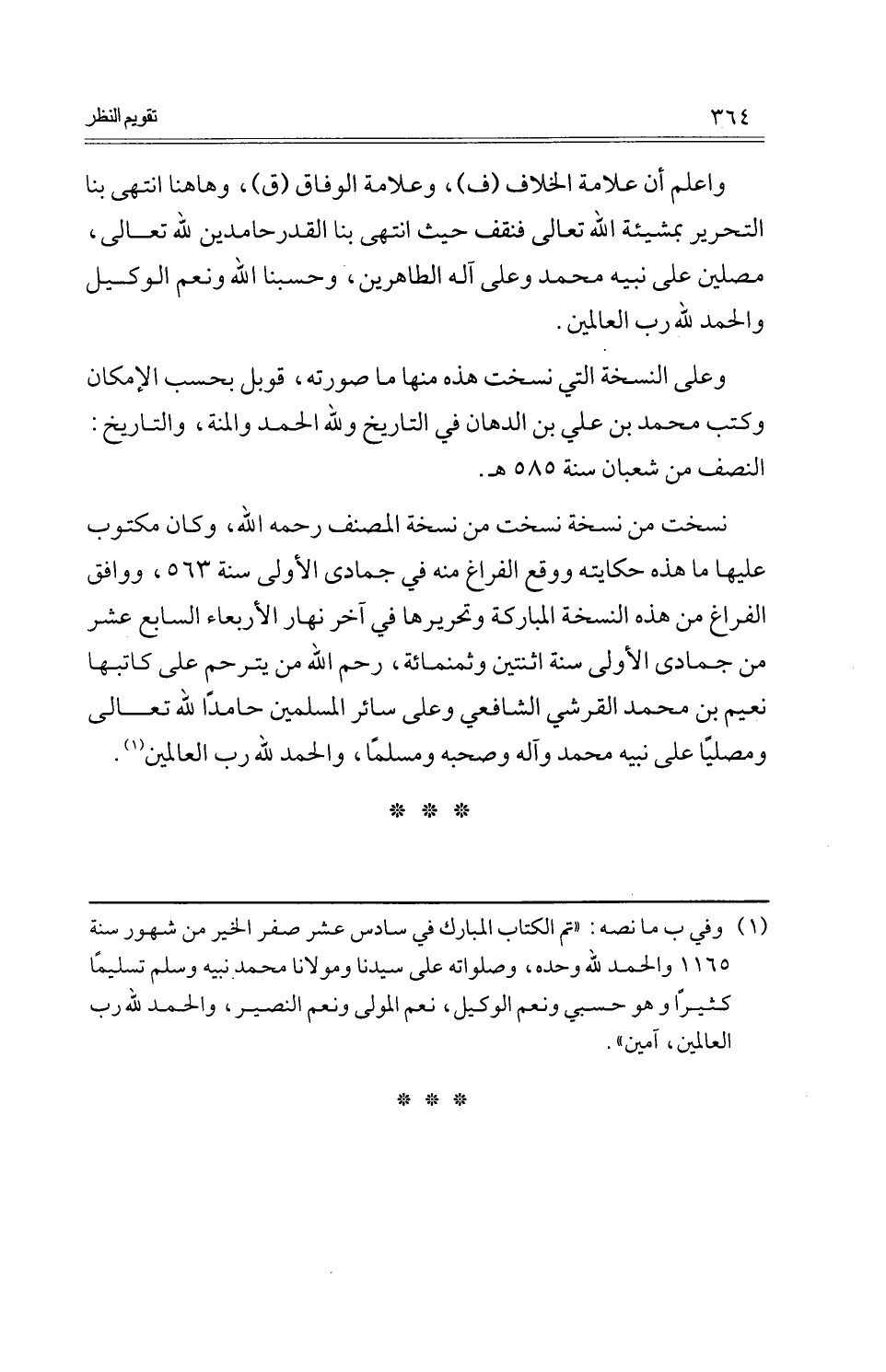 وعَلى النُّسْخَة الَّتِي نسخت هَذِه مِنْهَا مَا صورته، قوبل بِحَسب الْإِمْكَان وَكتب مُحَمَّد بن عَليّ بن الدهان فِي التَّارِيخ وَللَّه الْحَمد والْمنَّة، والتاريخ: النّصْف من شعْبَان سنة 585 هـ.