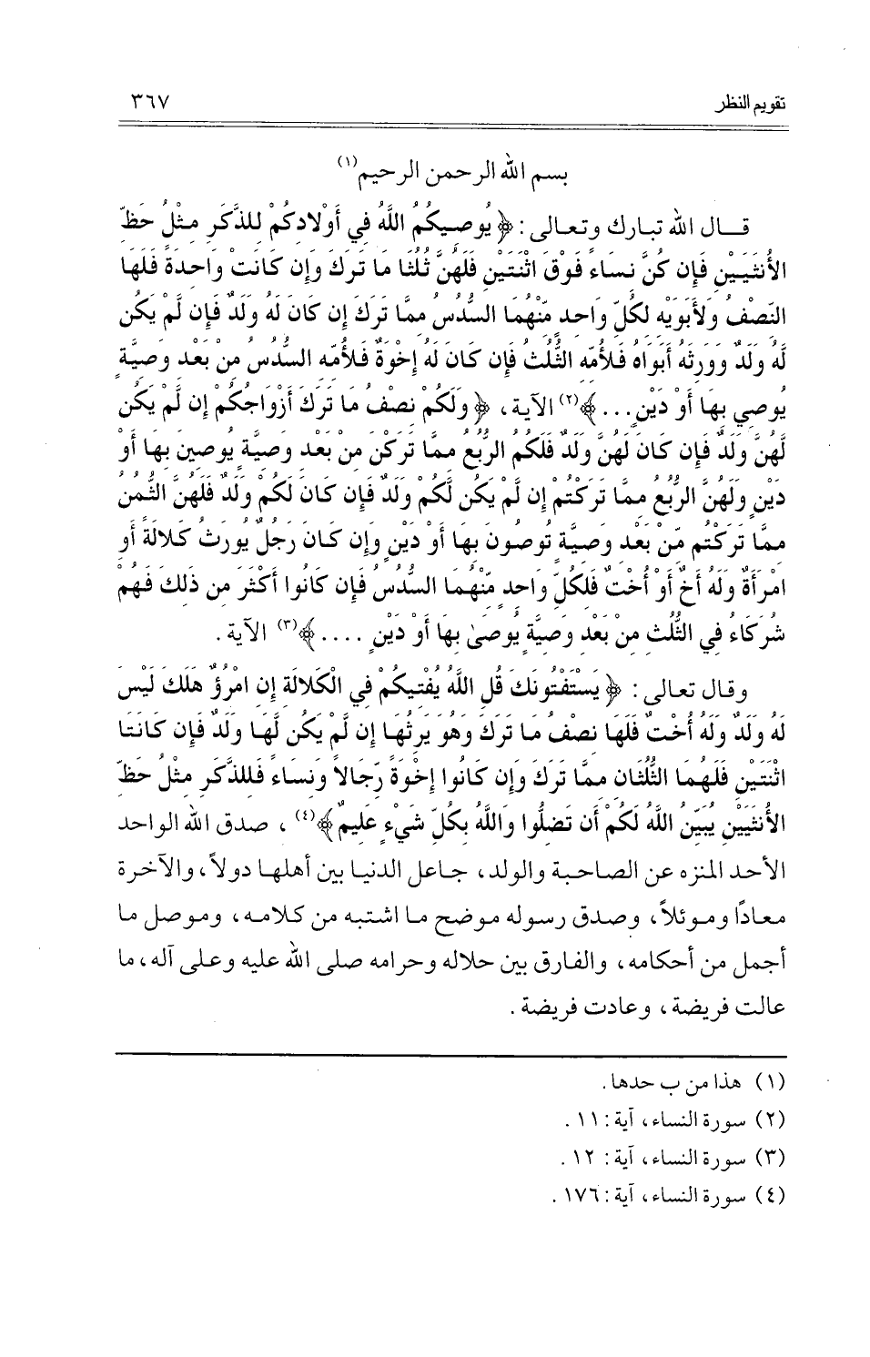وَقَالَ تَعَالَى: {يستفتونك قل اللَّهِ يفتيكم فِي الْكَلَالَة إِن امْرُؤ هلك لَيْسَ لَهُ ولد وَله أُخْت فلهَا نصف مَا ترك وَهُوَ يَرِثهَا إِن لم يكن لَهَا ولد فَإِن كَانَتَا اثْنَتَيْنِ فَلَهُمَا الثُّلُثَانِ مِمَّا ترك وَإِن كَانُوا إخْوَة رجَالًا وَنسَاء فللذكر مثل حَظّ الْأُنْثَيَيْنِ يبين اللَّهِ لكم أَن تضلوا وَالله بِكُل شَيْء عليم} ، صدق اللَّهِ الْوَاحِد الْأَحَد المنزه عَن الصاحبة وَالْولد، جَاعل الدُّنْيَا بَين أَهلهَا دولا، وَالْآخِرَة معادا وموئلا، وَصدق رَسُوله موضح مَا اشْتبهَ من كَلَامه، وموصل مَا أجمل من أَحْكَامه، والفارق بَين حَلَاله وَحَرَامه صلى اللَّهِ عَلَيْهِ وعَلى آله، وَمَا عالت فَرِيضَة، وعادت فَرِيضَة.