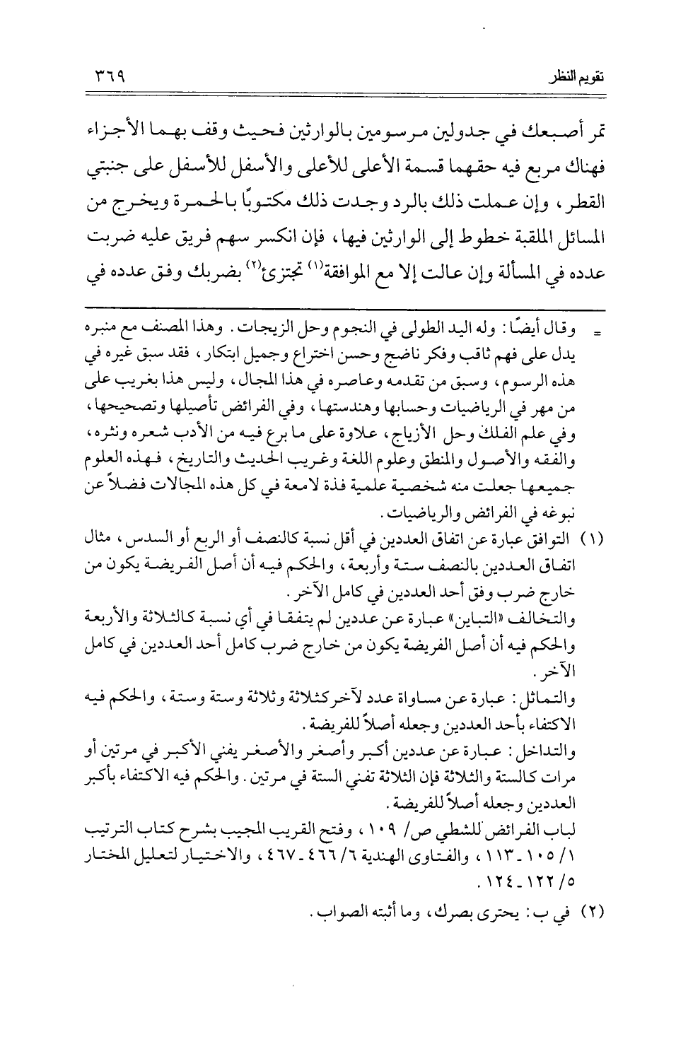 تمر أصبعك فِي جدولين مرسومين بالوارثين فَحَيْثُ وقف بهما الْأَجْزَاء فهناك مربع فِيهِ حَقّهمَا قسْمَة الْأَعْلَى للأعلى والأسفل للأسفل على جنبتي الْقطر، وَإِن عملت ذَلِك بِالرَّدِّ وجدت ذَلِك مَكْتُوبًا بالحمرة وَيخرج من الْمسَائِل الملقبة خطوط إِلَى الْوَارِثين فِيهَا، فَإِن انْكَسَرَ سهم فريق عَلَيْهِ ضربت عدده فِي الْمَسْأَلَة وَإِن عالت إِلَّا مَعَ الْمُوَافقَة تجتزئ بضربك وفْق عدده فِي