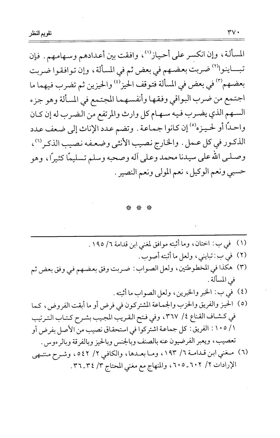 الْمَسْأَلَة، وَإِن انْكَسَرَ على أحياز، وَافَقت بَين أعدادهم وسهامهم. فَإِن تباينوا ضربت بَعضهم فِي بعض ثمَّ فِي الْمَسْأَلَة، وَإِن توافقوا ضربت بَعضهم فِي بعض فِي الْمَسْأَلَة فتوقف الحيز والحيزين ثمَّ تضرب فيهمَا مَا اجْتمع من ضرب الْبَوَاقِي وفقها وأنفسهما الْمُجْتَمع فِي الْمَسْأَلَة وَهُوَ جُزْء السهْم الَّذِي يضْرب فِيهِ سِهَام كل وَارِث والمرتفع من الضَّرْب لَهُ إِن كَانَ وَاحِدًا أَو لحيزه إِن كَانُوا جمَاعَة. وتضم عدد الْإِنَاث إِلَى ضعف عدد الذُّكُور فِي كل عمل. وَالْخَارِج نصيب الْأُنْثَى وَضَعفه نصيب الذّكر، وَصلى اللَّهِ على سيدنَا مُحَمَّد وعَلى آله وَصَحبه وَسلم تَسْلِيمًا كثيرا، وَهُوَ حسبي وَنعم الْوَكِيل، نعم الْمولى وَنعم النصير.