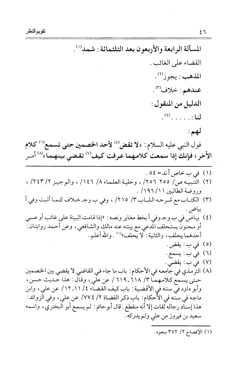 قَول النَّبِي عَلَيْهِ السَّلَام: " لَا تقضني لأحد الْخَصْمَيْنِ حَتَّى تسمع كَلَام الآخر؛ فَإنَّك إِذا سَمِعت كَلَامهمَا عرفت كَيفَ تقضي بَينهمَا " أَمر