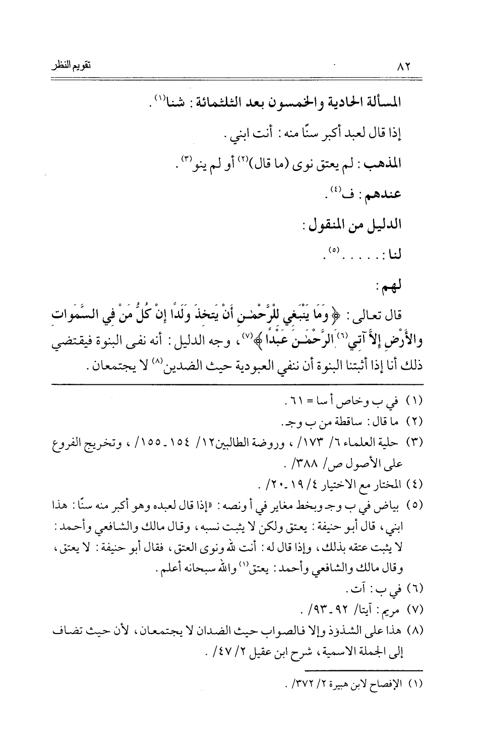 قَالَ تَعَالَى: {وَمَا يَنْبَغِي للرحمن أَن يتَّخذ ولدا إِن كل من فِي السَّمَوَات وَالْأَرْض إِلَّا آتِي الرَّحْمَن عبدا} ، وَجه الدَّلِيل: أَنه نفى الْبُنُوَّة فَيَقْتَضِي ذَلِك أَنا إِذا أثبتنا الْبُنُوَّة أَن ننفي الْعُبُودِيَّة حَيْثُ الضدين لَا يَجْتَمِعَانِ.