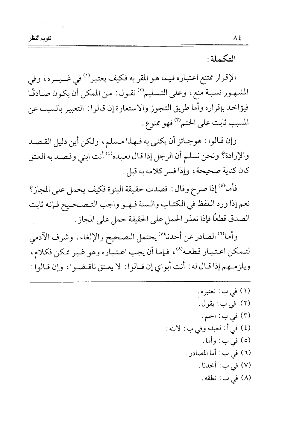 الْإِقْرَار مُمْتَنع اعْتِبَاره فِيمَا هُوَ الْمقر بِهِ فَكيف يعْتَبر فِي غَيره، وَفِي الْمَشْهُور نِسْبَة منع، وعَلى التَّسْلِيم نقُول: من الْمُمكن أَن يكون صَادِقا فيؤاخذ بِإِقْرَارِهِ وَأما طَرِيق التَّجَوُّز والاستعارة إِن قَالُوا: التَّعْبِير بِالسَّبَبِ عَن الْمُسَبّب ثَابت على الحتم فَهُوَ مَمْنُوع.