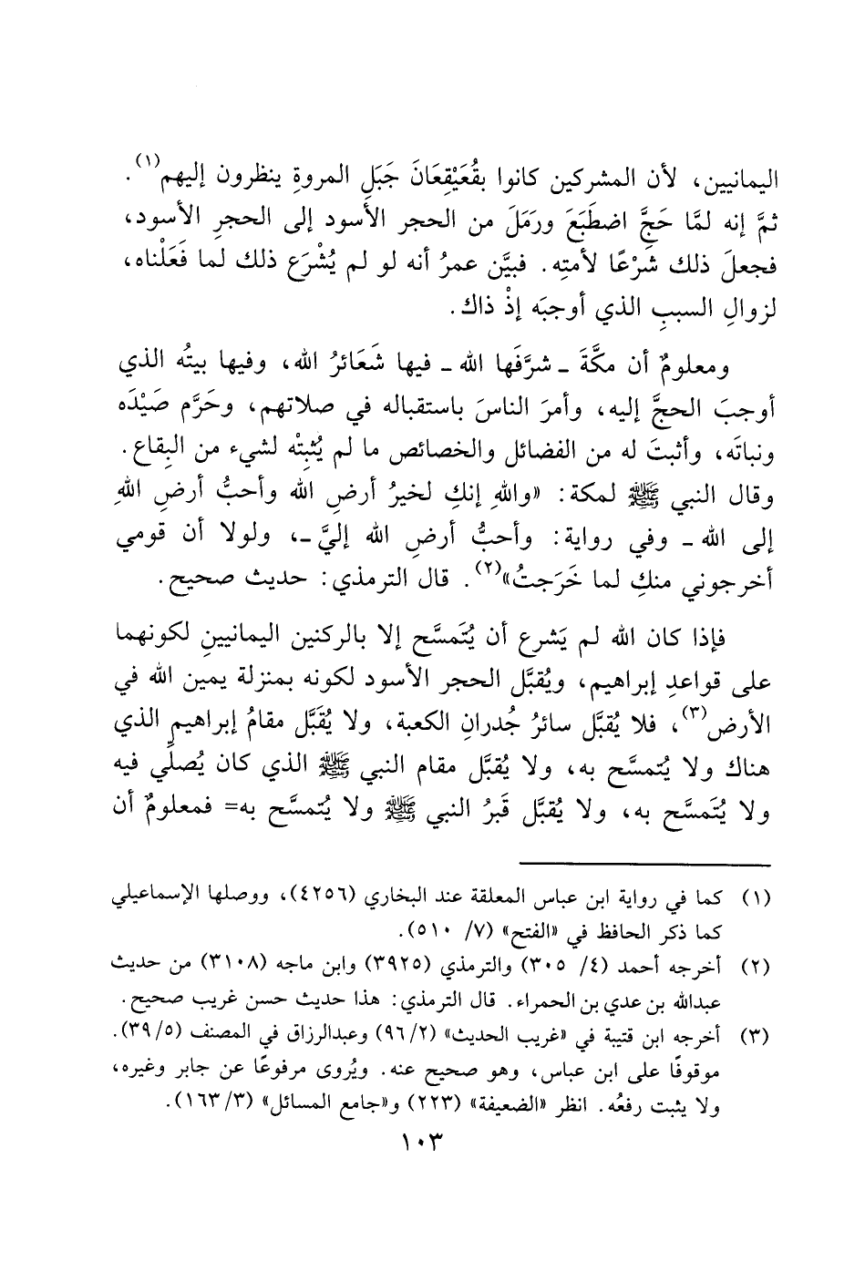 فإذا كان الله لم يَشرع أن يتمسَّح إلا بالركنين اليمانيينِ لكونهما على قواعدِ إبراهيم، ويُقبَّل الحجر الأسود لكونه بمنزلة يمين الله في الأرض (3)، فلا يُقبَّل سائرُ جُدرانِ الكعبة، ولا يُقَبَّل مقامُ إبراهيم الذي هناك ولا يتمسَّح به، ولا يُقبَّل مقام النبي - صَلَّى اللَّهُ عَلَيْهِ وَسَلَّمَ - الذي كان يُصلي فيه ولا يُتَمسَّح به، ولا يُقبَّل قَبرُ النبي - صَلَّى اللَّهُ عَلَيْهِ وَسَلَّمَ - ولا يتمسَّح به= فمعلوم أن