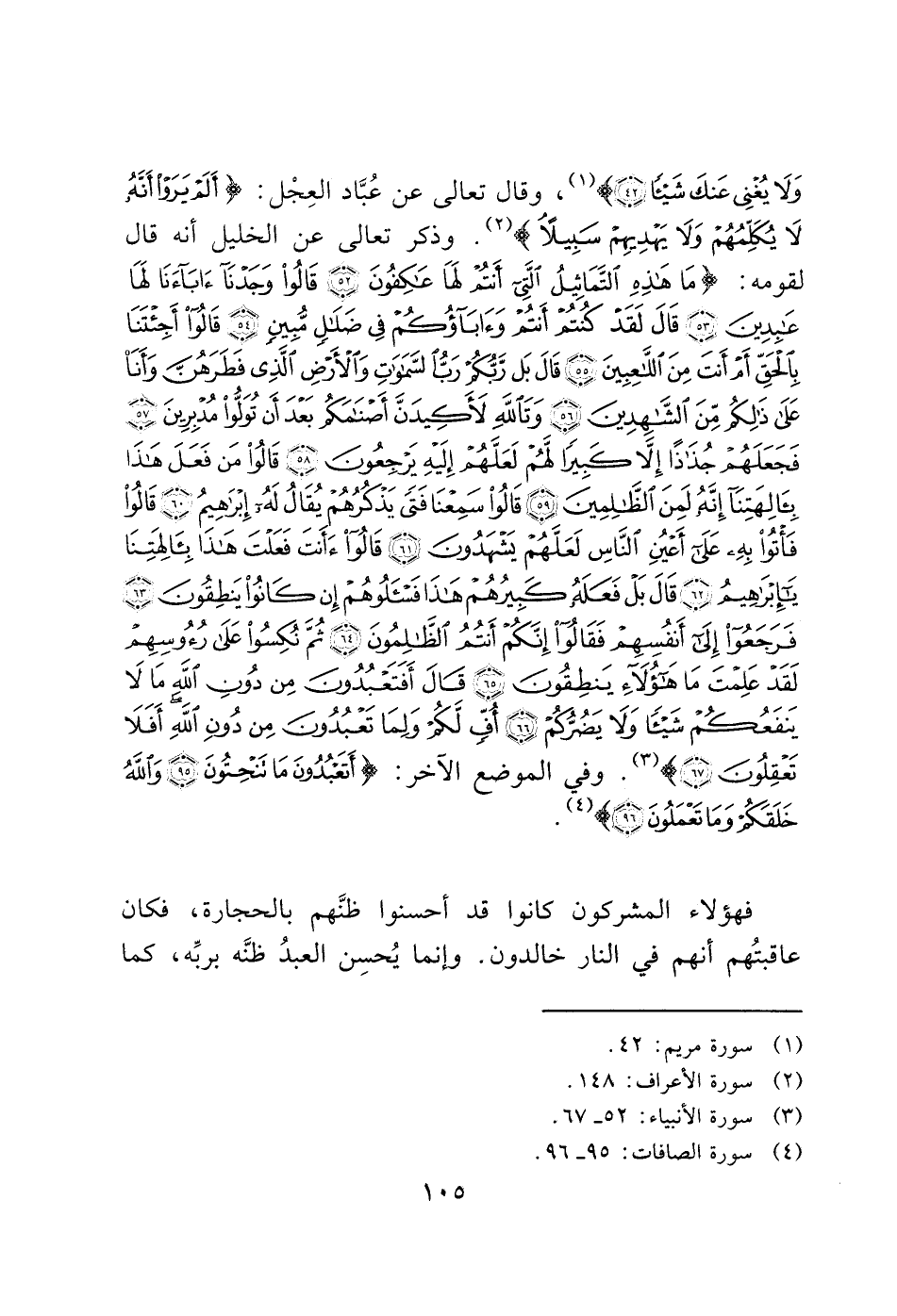 وَلَا يُغْنِي عَنْكَ شيئًا (42)) (1)، وقال تعالى عن عُبَّاد العِجْل: (أَلَمْ يَرَوْا أَنَّهُ لَا يُكَلِّمُهُمْ وَلَا يَهْدِيهِمْ سَبِيلًا) (2). وذكر تعالى عن الخليل أنه قال لقومه: (مَا هَذِهِ التَّمَاثِيلُ الَّتِي أَنْتُمْ لَهَا عَاكِفُونَ (52) قَالُوا وَجَدْنَا آَبَاءَنَا لَهَا عَابِدِينَ (53) قَالَ لَقَدْ كُنْتُمْ أَنْتُمْ وَآَبَاؤُكُمْ فِي ضَلَالٍ مُبِينٍ (54) قَالُوا أَجِئْتَنَا بِالْحَقِّ أَمْ أَنْتَ مِنَ اللَّاعِبِينَ (55) قَالَ بَلْ رَبُّكُمْ رَبُّ السَّمَاوَاتِ وَالْأَرْضِ الَّذِي فَطَرَهُنَّ وَأَنَا عَلَى ذَلِكُمْ مِنَ الشَّاهِدِينَ (56) وَتَاللَّهِ لَأَكِيدَنَّ أَصْنَامَكُمْ بَعْدَ أَنْ تُوَلُّوا مُدْبِرِينَ (57) فَجَعَلَهُمْ جُذَاذًا إِلَّا كَبِيرًا لَهُمْ لَعَلَّهُمْ إِلَيْهِ يَرْجِعُونَ (58) قَالُوا مَنْ فَعَلَ هَذَا بِآَلِهَتِنَا إِنَّهُ لَمِنَ الظَّالِمِينَ (59) قَالُوا سَمِعْنَا فَتًى يَذْكُرُهُمْ يُقَالُ لَهُ إِبْرَاهِيمُ (60) قَالُوا فَأْتُوا بِهِ عَلَى أَعْيُنِ النَّاسِ لَعَلَّهُمْ يَشْهَدُونَ (61) قَالُوا أَأَنْتَ فَعَلْتَ هَذَا بِآَلِهَتِنَا يَا إِبْرَاهِيمُ (62) قَالَ بَلْ فَعَلَهُ كَبِيرُهُمْ هَذَا فَاسْأَلُوهُمْ إِنْ كَانُوا يَنْطِقُونَ (63) فَرَجَعُوا إِلَى أَنْفُسِهِمْ فَقَالُوا إِنَّكُمْ أَنْتُمُ الظَّالِمُونَ (64) ثُمَّ نُكِسُوا عَلَى رُءُوسِهِمْ لَقَدْ عَلِمْتَ مَا هَؤُلَاءِ يَنْطِقُونَ (65) قَالَ أَفَتَعْبُدُونَ مِنْ دُونِ اللَّهِ مَا لَا يَنْفَعُكُمْ شيئًا وَلَا يَضُرُّكُمْ (66) أُفٍّ لَكُمْ وَلِمَا تَعْبُدُونَ مِنْ دُونِ اللَّهِ أَفَلَا تَعْقِلُونَ (67)) (3). وفي الموضع الآخر: (أَتَعْبُدُونَ مَا تَنْحِتُونَ (95) وَاللَّهُ خَلَقَكُمْ وَمَا تَعْمَلُونَ (96)) (4).