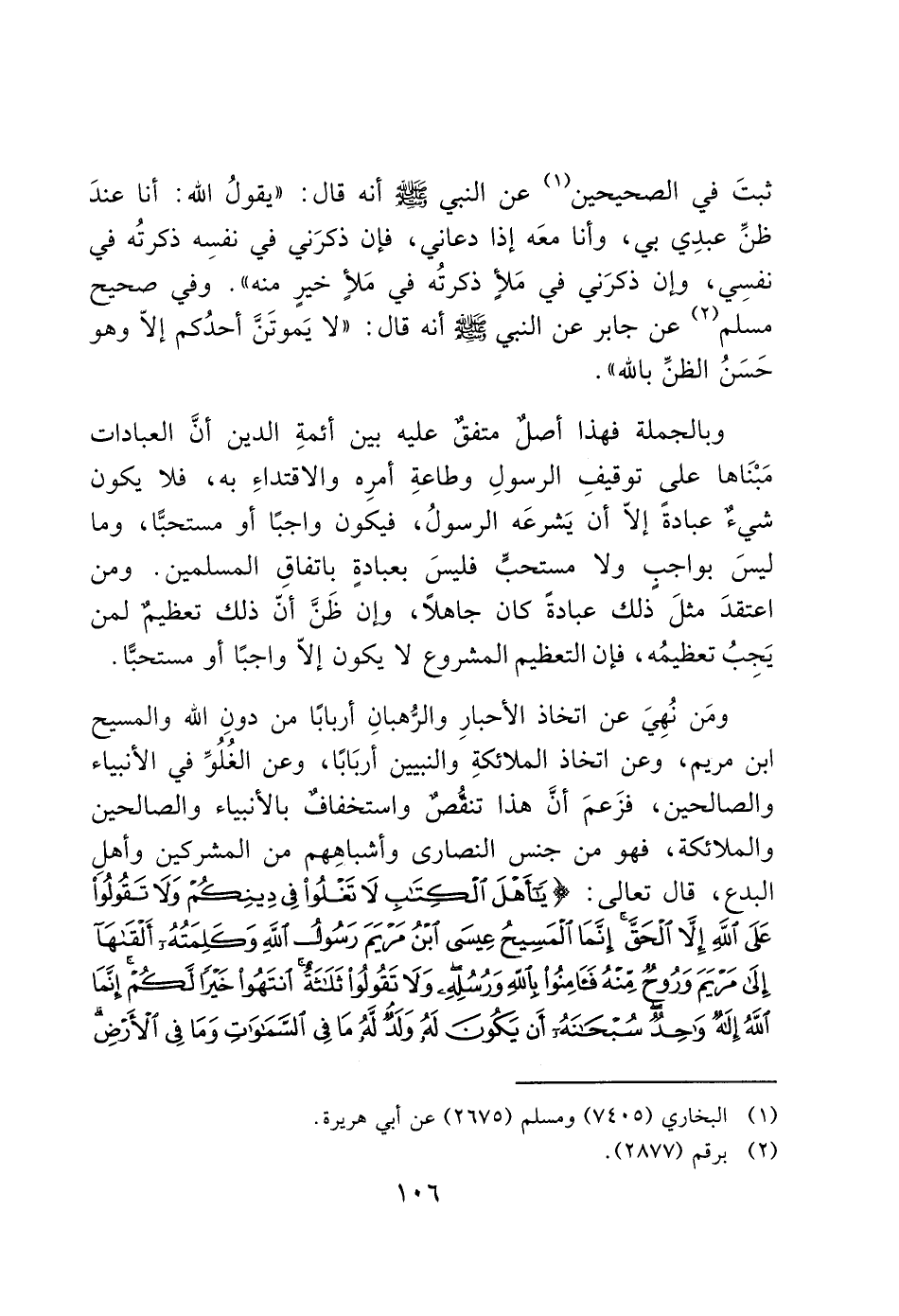 ومَن نُهِيَ عن اتخاذ الأحبارِ والرُّهبانِ أربابًا من دونِ الله والمسيح ابن مريم، وعن اتخاذ الملائكةِ والنبيين أربَابًا، وعن الغُلُوِّ في الأنبياء والصالحين، فزَعمَ أنَّ هذا تنقُّصٌ واستخفافٌ بالأنبياء والصالحين والملائكة، فهو من جنس النصارى وأشباهِهم من المشركين وأهلِ البدع، قال تعالى: (يَا أَهْلَ الْكِتَابِ لَا تَغْلُوا فِي دِينِكُمْ وَلَا تَقُولُوا عَلَى اللَّهِ إِلَّا الْحَقَّ إِنَّمَا الْمَسِيحُ عِيسَى ابْنُ مَرْيَمَ رَسُولُ اللَّهِ وَكَلِمَتُهُ أَلْقَاهَا إِلَى مَرْيَمَ وَرُوحٌ مِنْهُ فَآَمِنُوا بِاللَّهِ وَرُسُلِهِ وَلَا تَقُولُوا ثَلَاثَةٌ انْتَهُوا خَيْرًا لَكُمْ إِنَّمَا اللَّهُ إِلَهٌ وَاحِدٌ سُبْحَانَهُ أَنْ يَكُونَ لَهُ وَلَدٌ لَهُ مَا فِي السَّمَاوَاتِ وَمَا فِي الْأَرْضِ