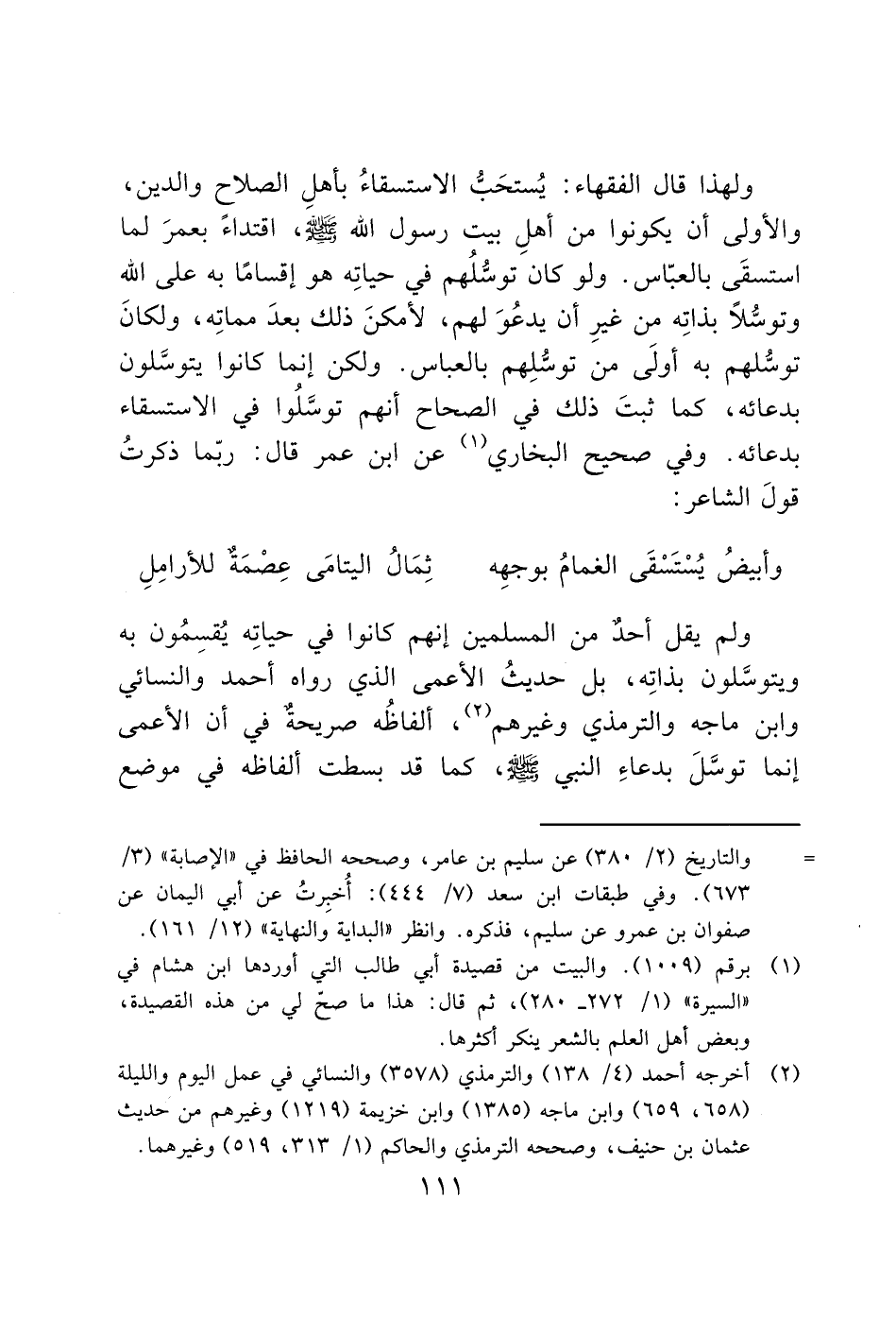 ولهذا قال الفقهاء: يُستحَبُّ الاستسقاءُ بأهلِ الصلاح والدين، والأولى أن يكونوا من أهلِ بيت رسول الله - صَلَّى اللَّهُ عَلَيْهِ وَسَلَّمَ -، اقتداءً بعمرَ لما استسقَى بالعبّاس. ولو كان توسُّلُهم في حياتِه هو إقسامًا به على الله وتوسُّلاً بذاتِه من غيرِ أن يدعُوَ لهم، لأمكنَ ذلك بعدَ مماتِه، ولكانَ توسُّلهم به أولَى من توسُّلِهم بالعباس. ولكن إنما كانوا يتوسَّلون بدعائه، كما ثبتَ ذلك في الصحاح أنهم توسَّلُوا في الاستسقاء بدعائه. وفي صحيح البخاري (1) عن ابن عمر قال: ربّما ذكرتُ قولَ الشاعر: