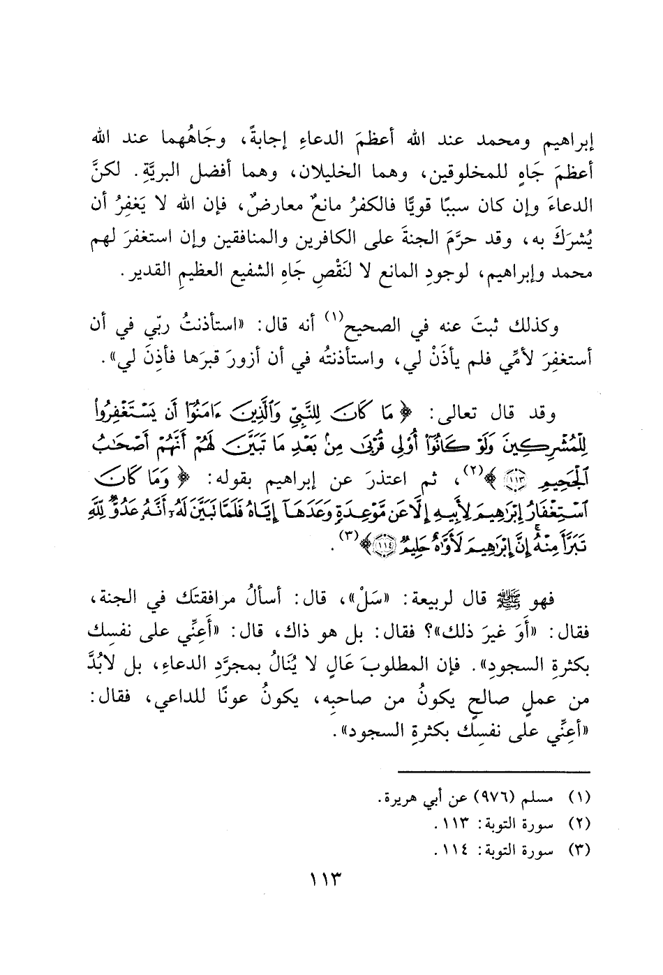 وقد قال تعالى: (مَا كَانَ لِلنَّبِيِّ وَالَّذِينَ آَمَنُوا أَنْ يَسْتَغْفِرُوا لِلْمُشْرِكِينَ وَلَوْ كَانُوا أُولِي قُرْبَى مِنْ بَعْدِ مَا تَبَيَّنَ لَهُمْ أَنَّهُمْ أَصْحَابُ الْجَحِيمِ (113)) (2)، ثم اعتذرَ عن إبراهيم بقوله: (وَمَا كَانَ اسْتِغْفَارُ إِبْرَاهِيمَ لِأَبِيهِ إِلَّا عَنْ مَوْعِدَةٍ وَعَدَهَا إِيَّاهُ فَلَمَّا تَبَيَّنَ لَهُ أَنَّهُ عَدُوٌّ لِلَّهِ تَبَرَّأَ مِنْهُ إِنَّ إِبْرَاهِيمَ لَأَوَّاهٌ حَلِيمٌ (114)) (3).