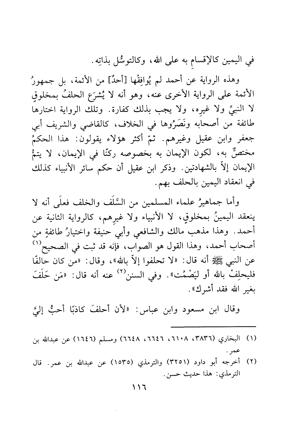 وهذه الرواية عن أحمد لم يُوافِقْها [أحد] من الأئمة، بل جمهورُ الأئمة على الرواية الأخرى عنه، وهو أنه لا يُشرَع الحلفُ بمخلوقٍ لا النبيِّ ولا غيرِه، ولا يجب بذلك كفارة. وتلك الرواية اختارها طائفة من أصحابه ونَصَرُوها في الخلاف، كالقاضي والشريف أبي جعفر وابن عقيل وغيرهم. ثمّ أكثر هؤلاء يقولون: هذا الحكمُ مختصٌّ به، لكون الإيمان به بخصوصه ركنًا في الإيمان، لا يتمُّ الإيمان إلاّ بالشهادتين. وذكر ابن عقيل أن حكم سائر الأنبياء كذلك في انعقاد اليمين بالحلف بهم.