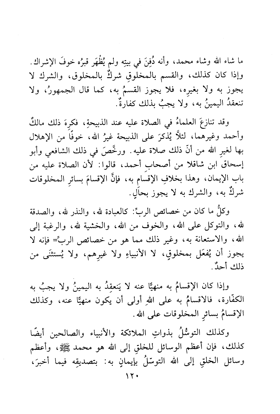 وكلُّ ما كان من خصائص الربِّ: كالعبادة لله، والنذر لله، والصدقة لله، والتوكل على الله، والخوف من الله، والخشية لله، والرغبة إلى الله، والاستعانة به، وغير ذلك مما هو من خصائص الربِّ= فإنه لا يجوز أن يُفعَل بمخلوق، لا الأنبياءِ ولا غيرِهم، ولا يُستثنَى من ذلك أحد.