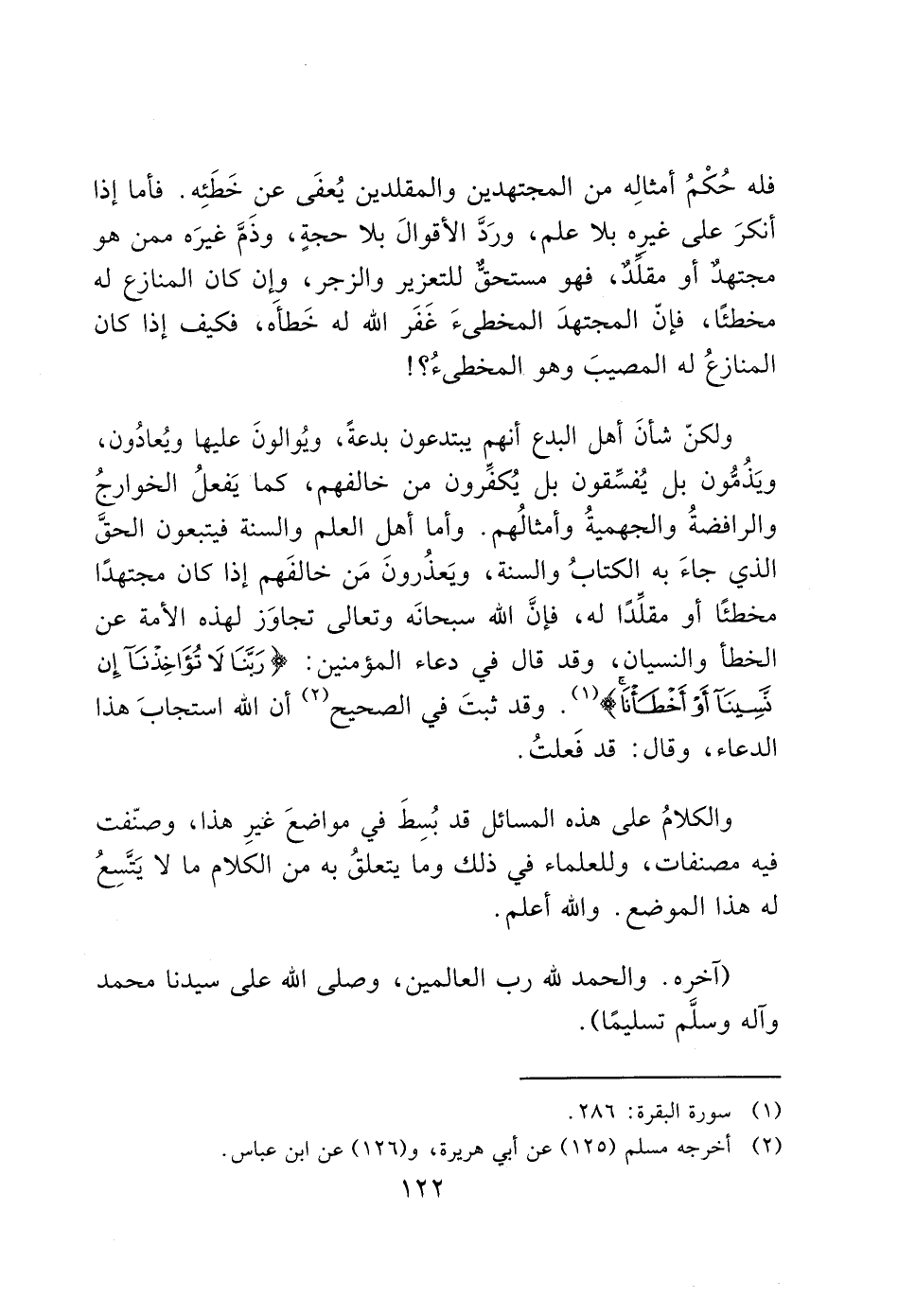 ولكنّ شأنَ أهل البدع أنهم يبتدعون بدعةً، ويُوالونَ عليها ويُعادُون، ويَذُمُّون بل يُفسِّقون بل يُكفرون من خالفهم، كما يَفعلُ الخوارجُ والرافضةُ والجهميةُ وأمثالُهم. وأما أهل العلم والسنة فيتبعون الحقَّ الذي جاءَ به الكتابُ والسنة، ويَعذُرونَ مَن خالفَهم إذا كان مجتهدًا مخطئًا أو مقلدًا له، فإنَّ الله سبحانَه وتعالى تجاوَز لهذه الأمة عن الخطأ والنسيان، وقد قال في دعاء المؤمنين: (رَبَّنَا لَا تُؤَاخِذْنَا إِنْ نَسِينَا أَوْ أَخْطَأْنَا) (1). وقد ثبتَ في الصحيح (2) أن الله استجابَ هذا الدعاء، وقال: قد فَعلتُ.