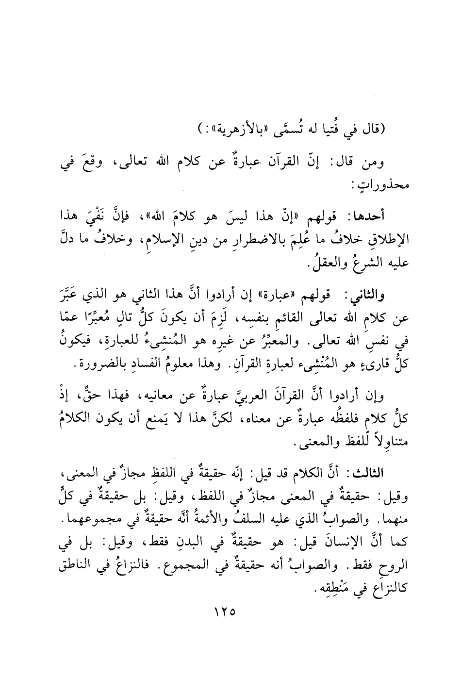 أحدها: قولهم "إنّ هذا ليسَ هو كلامَ الله"، فإنَّ نَفْيَ هذا الإطلاقِ خلافُ ما عُلِمَ بالاضطرارِ من دينِ الإسلامِ، وخلافُ ما دلَّ عليه الشرعُ والعقلُ.
