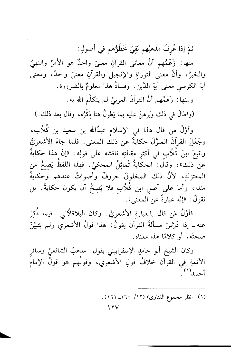 وأوَّلُ من قال هذا في الإسلام عبدُ الله بن سعيد بن كُلاَّب، وجَعَلَ القرآنَ المنزَّلَ حكايةً عن ذلك المعنى. فلما جاءَ الأشعريُّ واتبعَ ابنَ كُلاَّب في أكثرِ مقالتِه ناقشه على قوله: "إنّ هذا حكايةٌ عن ذلك"، وقالً: الحكايةُ تُماثِلُ المحكيَّ. فهذا اللفظُ يَصِحُّ من المعتزلةِ، لأنَّ ذلك المخلوقَ حروفٌ وأصواتٌ عندهم وحكايةٌ مثله، وأما على أصلِ ابن كُلاَّبٍ فلا يَصِحُّ أن يكون حكايةً. بل نقولُ: "إنّه عبارةٌ عن المعنى".