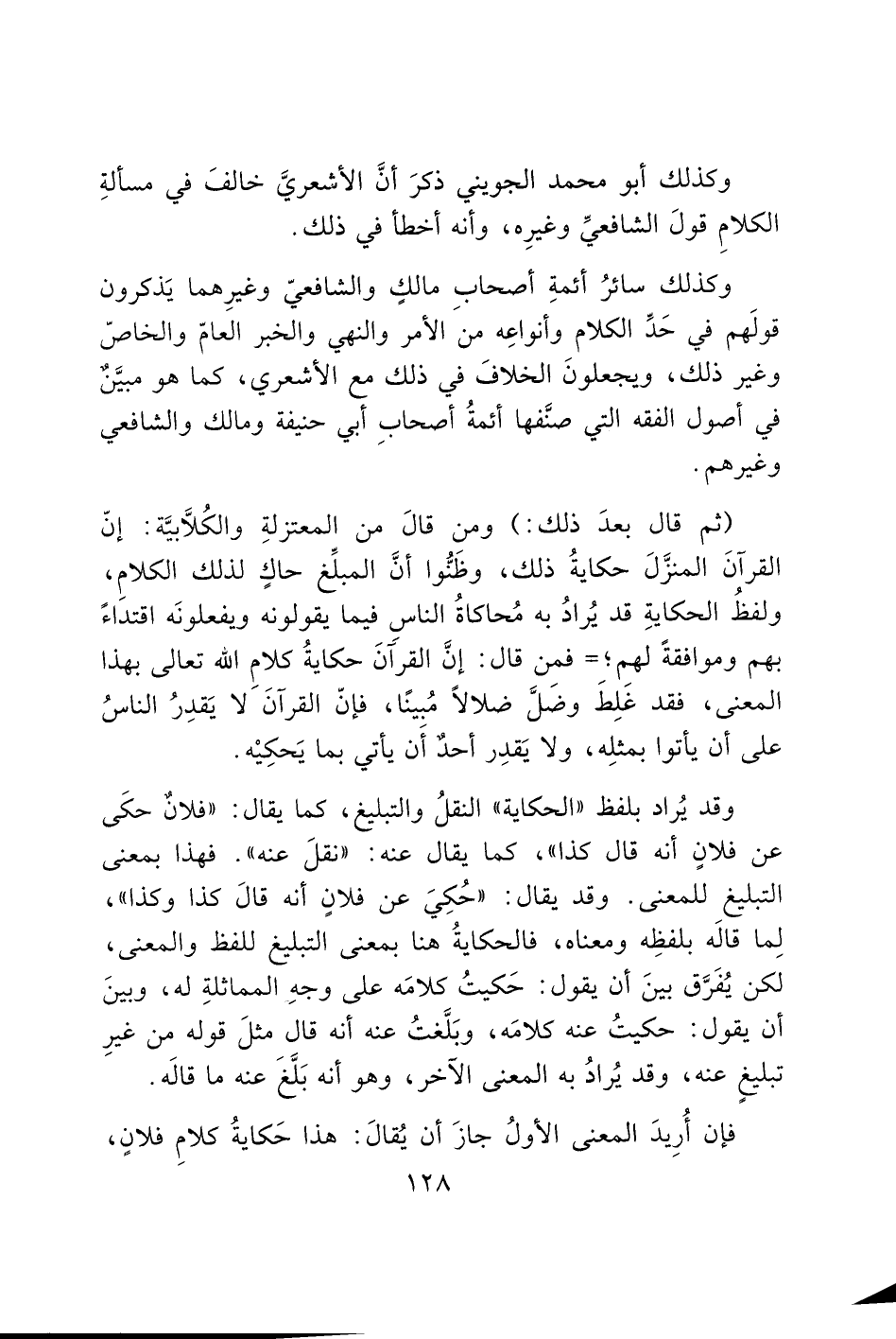 وكذلك سائرُ أئمةِ أصحابِ مالكٍ والشافعيّ وغيرِهما يَذكرون قولَهم في حَدِّ الكلام وأنواعِه من الأمر والنهي والخبر العامّ والخاصّ وغير ذلك، ويجعلونَ الخلافَ في ذلك مع الأشعري، كما هو مبيَّنٌ في أصول الفقه التي صنفها أئمةُ أصحابِ أبي حنيفة ومالك والشافعي وغيرهم.