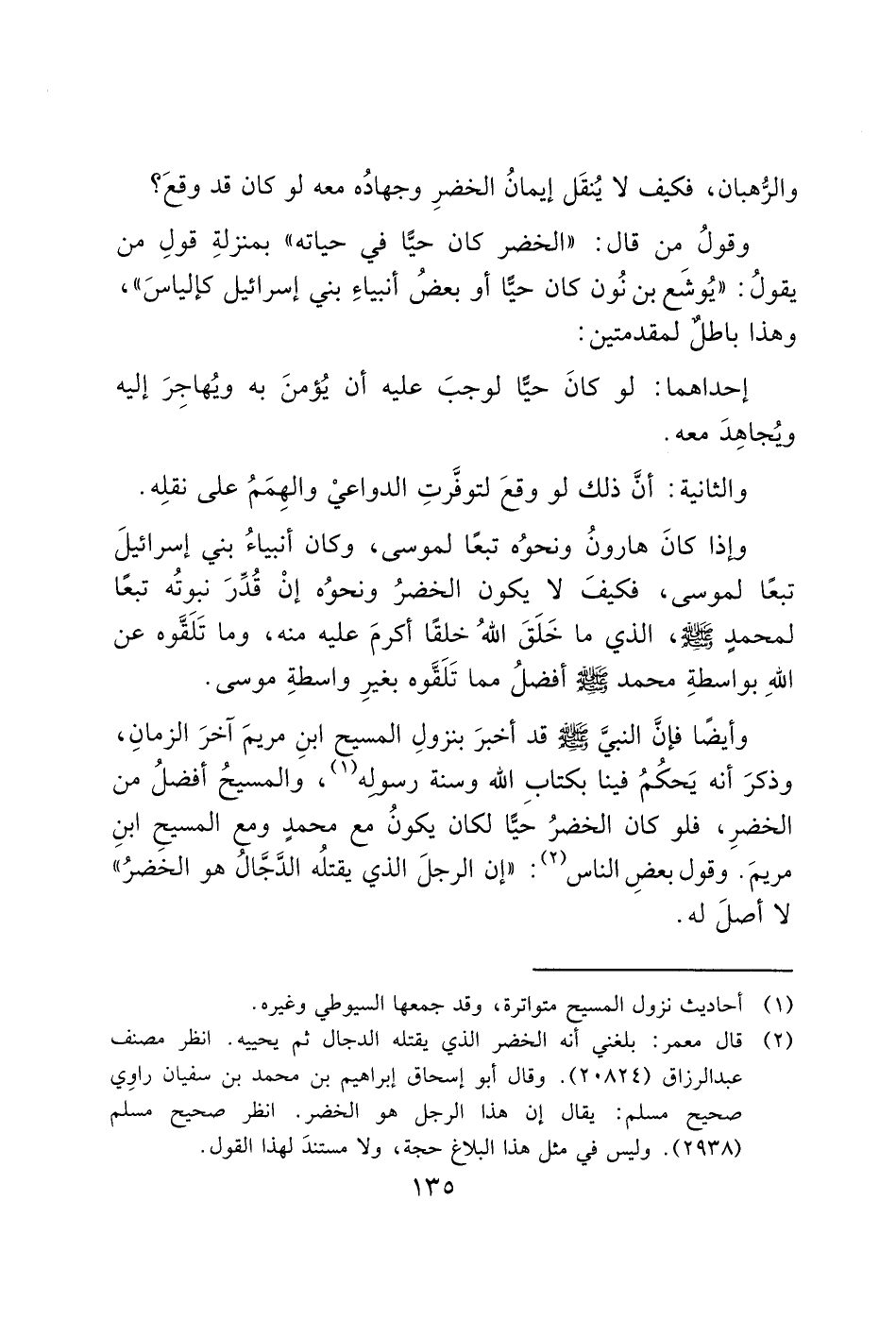 وأيضًا فإنَ النبيَّ - صَلَّى اللَّهُ عَلَيْهِ وَسَلَّمَ - قد أخبرَ بنزولِ المسيح ابنِ مريمَ آخرَ الزمانِ، وذكرَ أنه يَحكُمُ فينا بكتاب الله وسنة رسوله (1)، والمسيحُ أفضلُ من الخضرِ، فلو كان الخضرُ حَيًّا لكان يكونُ مع محمدٍ ومع المسيحِ ابنِ مريمَ. وقول بعضِ الناس (2): "إن الرجلَ الذي يقتلُه الدَّجَّالُ هو الخضرُ" لا أصلَ له.