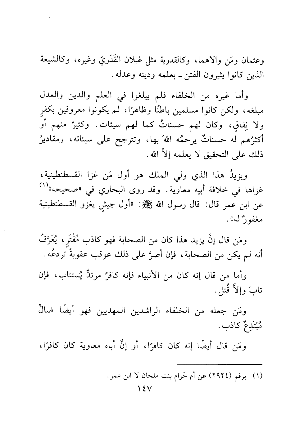 ومَن قال إنَّ يزيد هذا كان من الصحابة فهو كاذب مُفْتَرٍ، يُعَرَّفُ أنه لم يكن من الصحابة، فإن أصرَّ على ذلك عوقب عقوبةً تردعُه.
