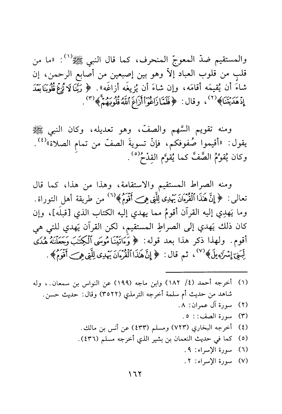 ومنه الصراط المستقيم والاستقامة، وهذا من هذا، كما قال تعالى: (إِنَّ هَذَا الْقُرْآَنَ يَهْدِي لِلَّتِي هِيَ أَقْوَمُ) (6) من طريقة أهل التوراة.