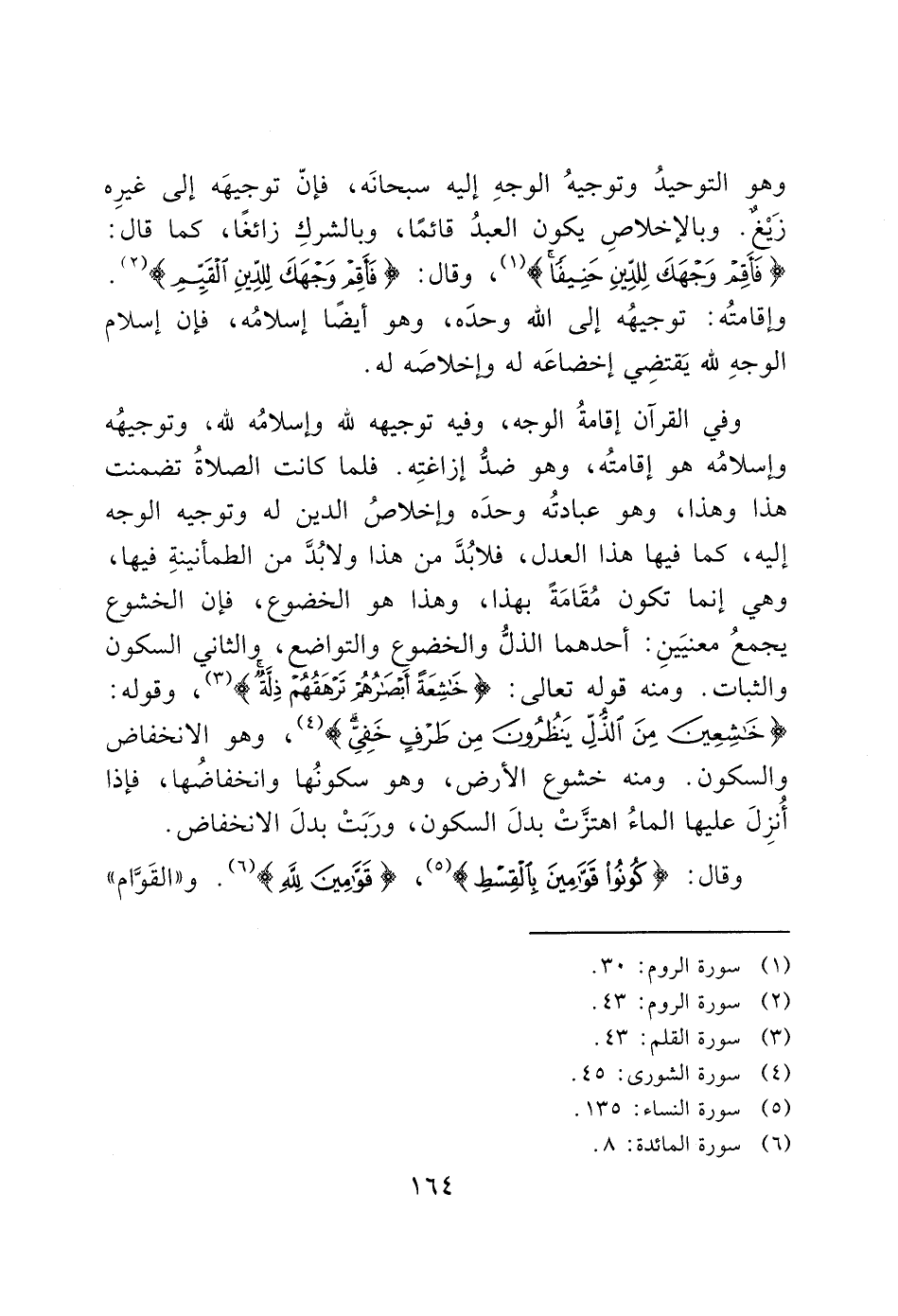 وفي القرآن إقامةُ الوجه، وفيه توجيهه لله وإسلامُه لله، وتوجيهُه وإسلامُه هو إقامتُه، وهو ضدُّ إزاغتِه. فلما كانت الصلاةُ تضمنت هذا وهذا، وهو عبادتُه وحدَه وإخلاصُ الدين له وتوجيه الوجه إليه، كما فيها هذا العدل، فلابُدَّ من هذا ولابُدَّ من الطمأنينةِ فيها، وهي إنما تكون مُقَامَةً بهذا، وهذا هو الخضوع، فإن الخشوع يجمعُ معنيَينِ: أحدهما الذلُّ والخضوعِ والتواضع، والثاني السكون والثبات. ومنه قوله تعالى: (خَاشِعَةً أَبْصَارُهُمْ تَرْهَقُهُمْ ذِلَّةٌ) (3)، ودوله: (خَاشِعِينَ مِنَ الذُّلِّ يَنْظُرُونَ مِنْ طَرْفٍ خَفِيٍّ) (4)، وهو الانخفاض والسكون. ومنه خشوع الأرض، وهو سكونُها وانخفاضُها، فإذا أُنزِلَ عليها الماءُ اهتزَّتْ بدلَ السكون، ورَبَتْ بدلَ الانخفاض.