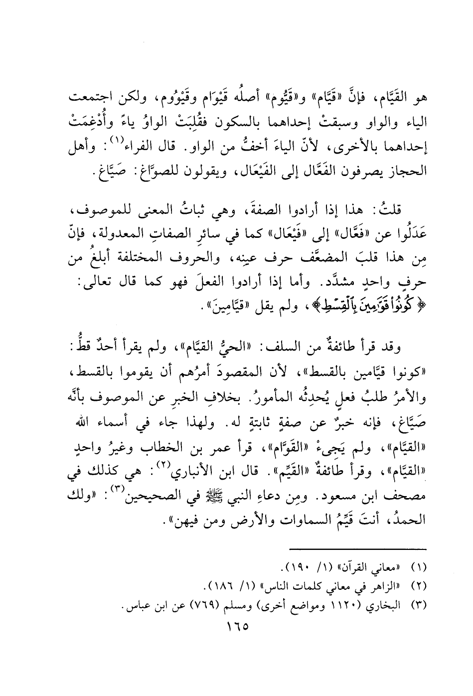 وقد قرأ طائفة من السلف: "الحيُّ القيَّام"، ولم يقرأ أحدٌ قطُّ: "كونوا قيَّامين بالقسط"، لأن المقصودَ أمرُهم أن يقوموا بالقسط، والأمرُ طلبُ فعل يُحدِثُه المأمورُ. بخلافِ الخبرِ عن الموصوف بأنه صَيَّاغ، فإنه خبرٌ عن صفةٍ ثابتةٍ له. ولهذا جاء في أسماء الله "القيَّام"، ولم يَجئْ "القَوَّام"، قرأ عمر بن الخطاب وغيرُ واحد "القيَّام"، وقرأ طَائفةٌ "القَيِّم". قال ابن الأنباري (2): هي كذلك في مصحف ابن مسعود. ومِن دعاءِ النبي - صَلَّى اللَّهُ عَلَيْهِ وَسَلَّمَ - في الصحيحين (3): "ولك الحمدُ، أنتَ قَيِّمُ السماوات والأرض ومن فيهن".
