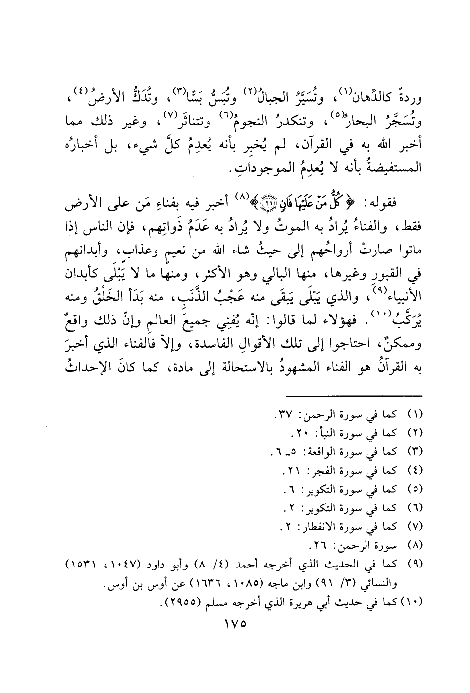 فقوله: (كُلُّ مَنْ عَلَيْهَا فَانٍ (26)) (8) أخبر فيه بفناءِ مَن على الأرض فقط، والفناءُ يُرادُ به الموتُ ولا يُرادُ به عَدَمُ ذَواتِهم، فإن الناس إذا ماتوا صارتْ أرواحُهم إلى حيثُ شاء الله من نعيمٍ وعذاب، وأبدانهم في القبور وغيرها، منها البالي وهو الأكثر، ومنها ما لا يًبْلَى كأبدان الأنبياء (9)، والذي يَبْلَى يَبقَى منه عَجْبُ الذَّنَب، منه بَدَأ الخَلْقُ ومنه يُرَكَّبُ (10). فهؤلاء لما قالوا: إنّه يُفنِي جميع العالمِ وإنّ ذلك واقع وممكن، احتاجوا إلى تلك الأقوالِ الفاسدة، وإلاّ فالفناء الذي أخبرَ به القرآنُ هو الفناء المشهودُ بالاستحالة إلى مادة، كما كانَ الإحداثُ