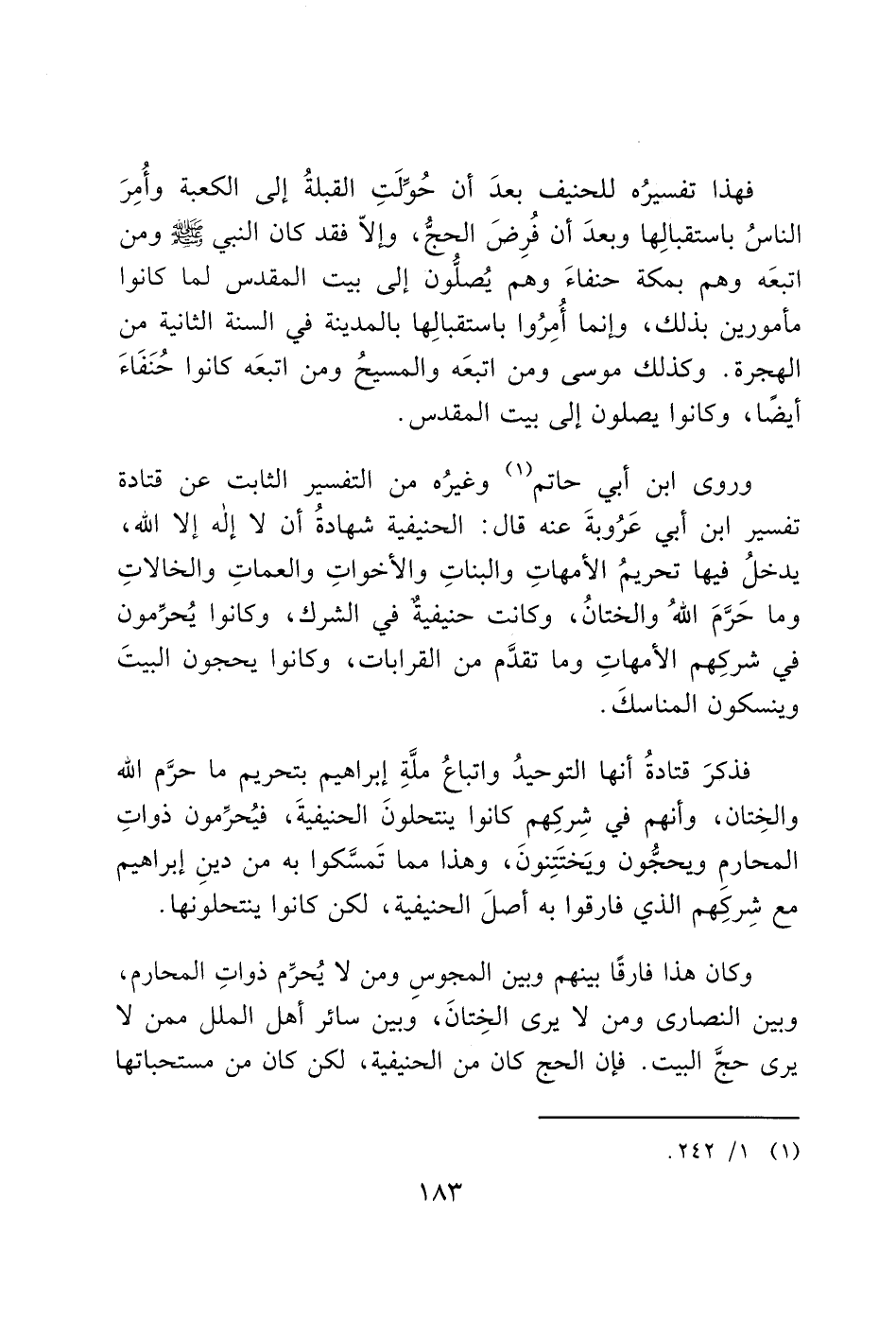 فهذا تفسيرُه للحنيف بعدَ أن حُولَتِ القبلةُ إلى الكعبة وأُمِرَ الناسُ باستقبالِها وبعدَ أن فُرِضَ الحجُّ، وإلاّ فقد كان النبي - صَلَّى اللَّهُ عَلَيْهِ وَسَلَّمَ - ومن اتبعَه وهم بمكة حنفاءَ وهم يُصلُّون إلى بيت المقدس لما كانوا مأمورين بذلك، وإنما أُمِرُوا باستقبالِها بالمدينة في السنة الثانية من الهجرة. وكذلك موسى ومن اتبعَه والمسيحُ ومن اتبعَه كانوا حُنَفَاءَ أيضًا، وكانوا يصلون إلى بيت المقدس.