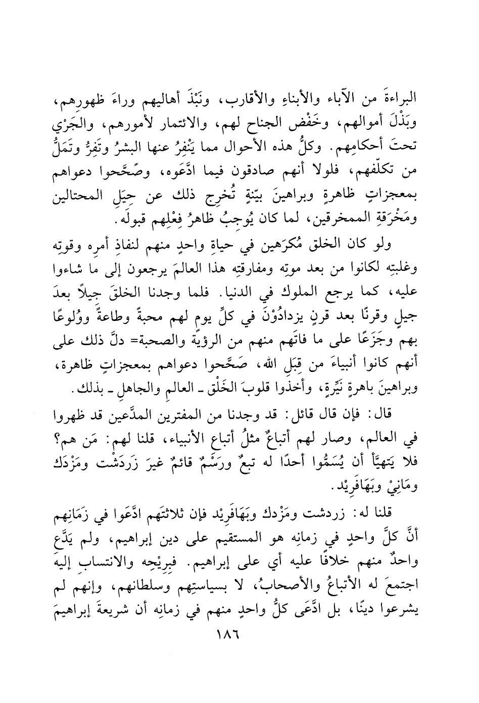 قلنا له: زردشت ومَزْدك وبَهَافَرِيْد فإن ثلاثتهم ادَّعَوا في زَمَانِهم أنَ كلَّ واحد في زمانِه هو المستقيم على دين إبراهيم، ولم يَدع واحد منهم خلافًا عليه أي على إبراهيم. فبِرِيْحِه والانتسابِ إليهَ اجتمعَ له الأتباعُ والأصحابُ، لا بسياستِهم وسلطانهم، وإنهم لم يشرعوا دينًا، بل ادعَى كلُّ واحدٍ منهم في زمانِه أن شريعةَ إبراهيمَ