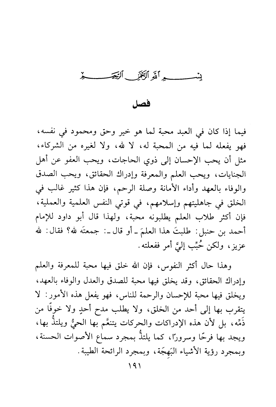 وهذا حال أكثر النفوس، فإن الله خلق فيها محبة للمعرفة والعلم وإدراك الحقائق، وقد يخلق فيها محبة للصدق والعدل والوفاء بالعهد، ويخلق فيها محبة للإحسان والرحمة للناس، فهو يفعل هذه الأمور: لا يتقرب بها إلى أحد من الخلق، ولا يطلب مدح أحدٍ ولا خوفًا من ذَمِّه، بل لأن هذه الإدراكات والحركات يتنعَّم بها الحيُّ ويلتذُّ بها، ويجد بها فرحًا وسرورًا، كما يلتذُّ بمجرد سماع الأصوات الحسنة، وبمجرد رؤية الأشياء البَهِجَة، وبمجرد الرائحة الطيبة.
