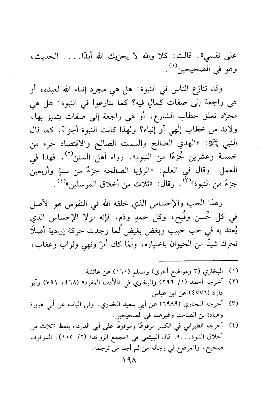 وقد تنازع الناس في النبوة: هل هي مجرد إنباء الله لعبده، أو هي راجعة إلى صفات كمالٍ فيه؟ كما تنازعوا في النبوة: هل هي مجرَّد تعلق خطاب الشارع، أو هي راجعة إلى صفات يتميز بها، ولابد من خطاب إلهي أو إنباء؟ ولهذا كانت النبوة أجزاءً، كما قال النبي - صَلَّى اللَّهُ عَلَيْهِ وَسَلَّمَ -: "الهدي الصالح والسمت الصالح والاقتصاد جزء من خمسة وعشرين جُزءًا من النبوة". رواه أهل السنن (2)، فهذا في العمل. وقال في العلم: "الرؤيا الصالحة جزءٌ من ستةٍ وأربعين جزءً من النبوة" (3). وقال: "ثلاث من أخلاق المرسلين" (4).