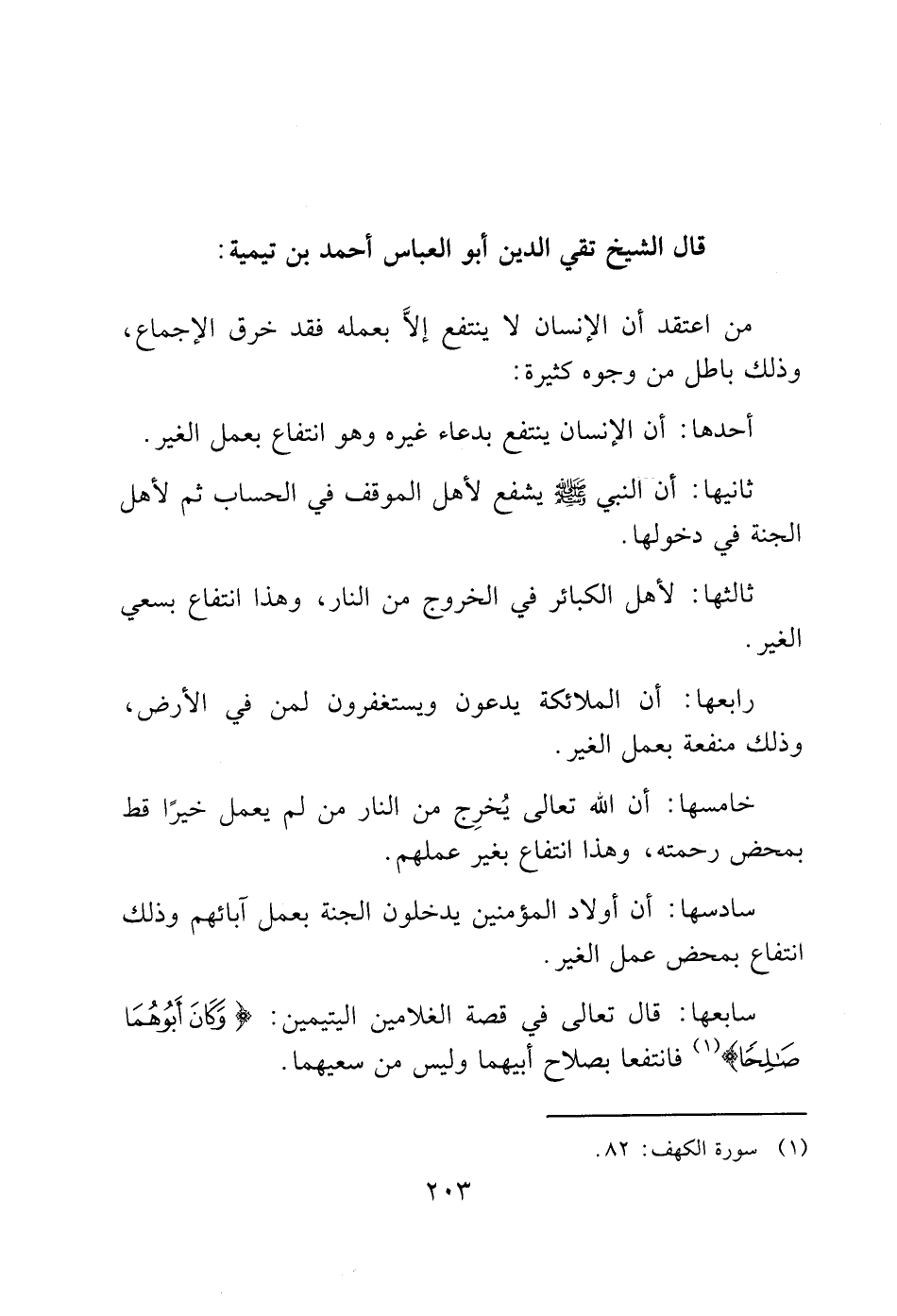 من اعتقد أن الإنسان لا ينتفع إلاَّ بعمله فقد خرق الإجماع، وذلك باطل من وجوه كثيرة: