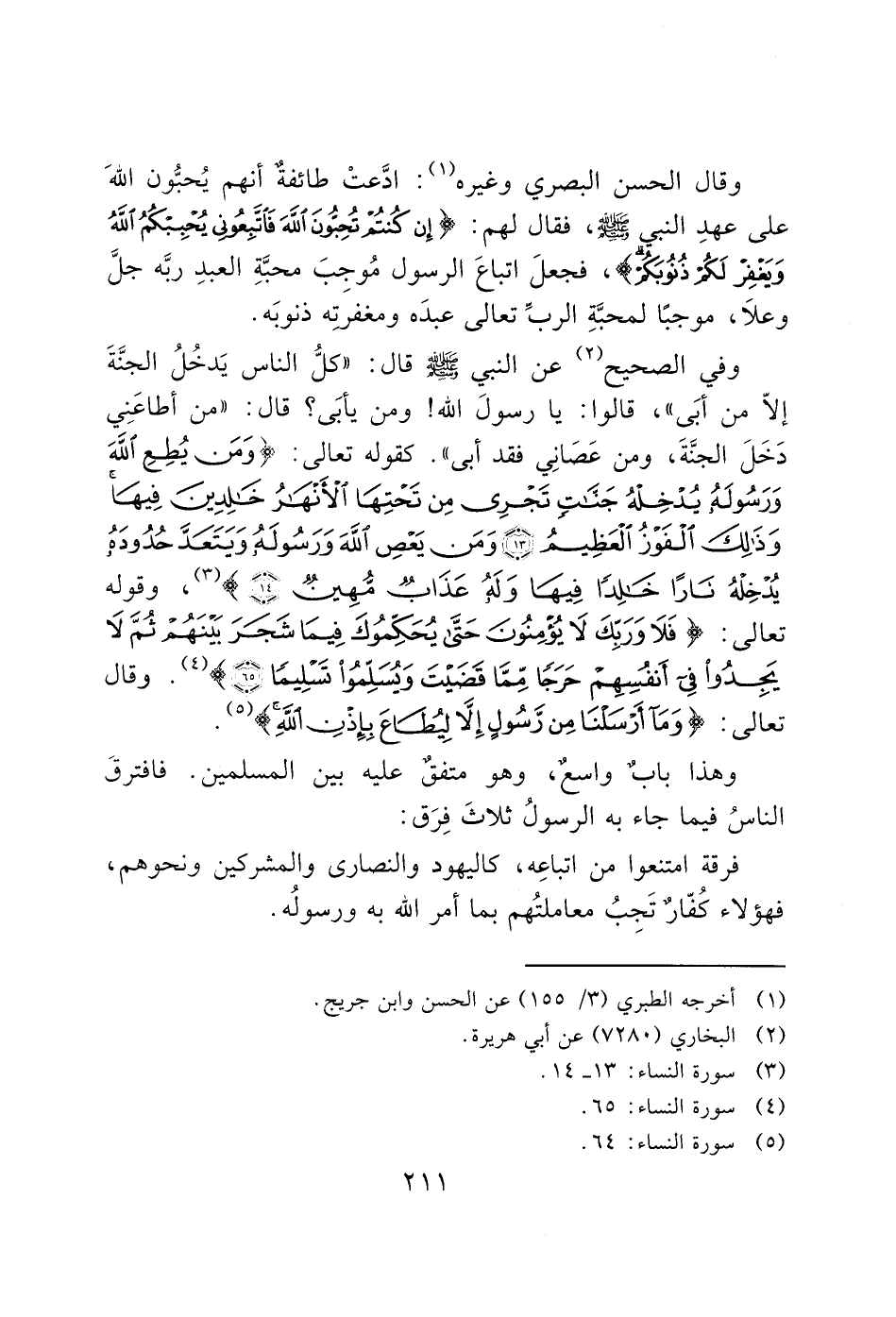 وفي الصحيح (2) عن النبي - صَلَّى اللَّهُ عَلَيْهِ وَسَلَّمَ - قال: "كلُّ الناس يَدخُلُ الجنَّةَ إلاّ من أبَى"، قالوا: يا رسولَ الله! ومن يأبَى؟ قال: "من أطاعَنِي دَخَلَ الجنَّةَ، ومن عَصَانِي فقد أبي". كقوله تعالِى: (وَمَنْ يُطِعِ اللَّهَ وَرَسُولَهُ يُدْخِلْهُ جَنَّاتٍ تَجْرِي مِنْ تَحْتِهَا الْأَنْهَارُ خَالِدِينَ فِيهَا وَذَلِكَ الْفَوْزُ الْعَظِيمُ (13) وَمَنْ يَعْصِ اللَّهَ وَرَسُولَهُ وَيَتَعَدَّ حُدُودَهُ يُدْخِلْهُ نَارًا خَالِدًا فِيهَا وَلَهُ عَذَابٌ مُهِينٌ (14)) (3)، وقوله تعالى: (فَلَا وَرَبِّكَ لَا يُؤْمِنُونَ حَتَّى يُحَكِّمُوكَ فِيمَا شَجَرَ بَيْنَهُمْ ثُمَّ لَا يَجِدُوا فِي أَنْفُسِهِمْ حَرَجًا مِمَّا قَضَيْتَ وَيُسَلِّمُوا تَسْلِيمًا (65)) (5).