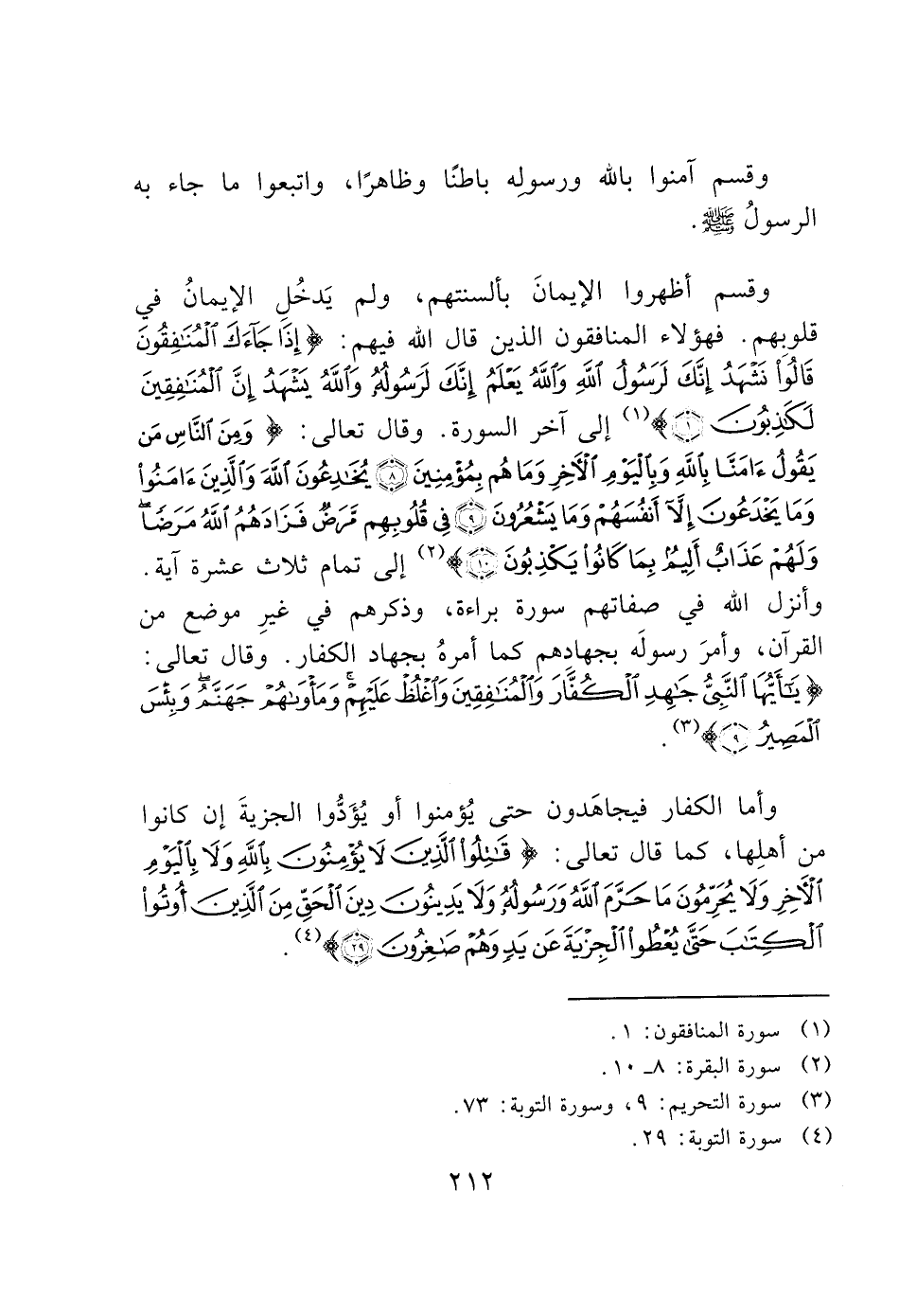 وأنزل الله في صفاتهم سورة براءة، وذكرهم في غيرِ موضع من القرآن، وأمرَ رسولَه بجهادِهم كما أمرهُ بجهاد الكفار. وقال تعالى: (يَا أَيُّهَا النَّبِيُّ جَاهِدِ الْكُفَّارَ وَالْمُنَافِقِينَ وَاغْلُظْ عَلَيْهِمْ وَمَأْوَاهُمْ جَهَنَّمُ وَبِئْسَ الْمَصِيرُ (9)) (3).