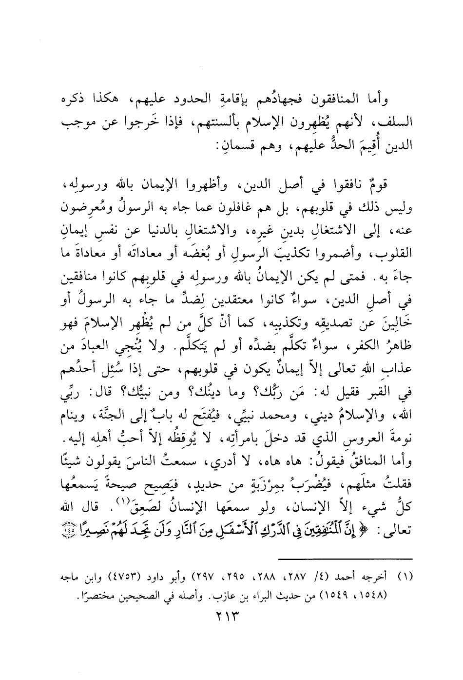 قوم نافقوا في أصل الدين، وأظهروا الإيمان بالله ورسوله، وليس ذلك في قلوبهم، بل هم غافلون عما جاء به الرسولُ ومُعرِضون عنه، إلى الاشتغالِ بدينِ غيرِه، والاشتغالِ بالدنيا عن نفسِ إيمانِ القلوب، وأضمروا تكذيبَ الرسولِ أو بُغضه أو معاداتَه أو معاداة ما جاءَ به. فمتى لم يكن الإيمانُ بالله ورسوله في قلوبِهم كانوا منافقين في أصلِ الدين، سواءٌ كانوا معتقدين لِضدِّ ما جاء به الرسولُ أو خَالِينَ عن تصديقِه وتكذيبه، كما أنّ كلَّ من لم يُظْهِر الإسلامَ فهو ظاهرُ الكفر، سواء تكلَّم بَضدِّه أو لم يَتكلَّم. ولا يُنْجِي العبادَ من عذاب الله تعالى إلاّ إيمان يكون في قلوبهم، حتى إذا سُئِل أحدُهم في الَقبر فقيل له: مَن ربُّك؟ وما دينُك؟ ومن نبيُّك؟ قال: ربِّي الله، والإسلامُ ديني، ومحمد نبيِّي، فيُفتَح له باب إلى الجنَّة، وينام نومةَ العروسِ الذي قد دخلَ بامرأتِه، لا يُوقِظُه إلاّ أحبُّ أهلِه إليه.