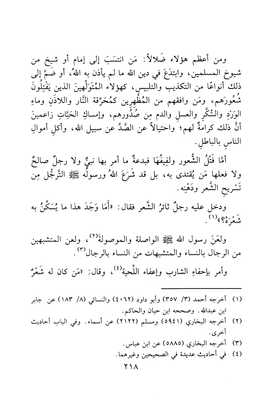 ولعَنَ رسول الله - صَلَّى اللَّهُ عَلَيْهِ وَسَلَّمَ - الواصلة والموصولةَ (2)، ولعن المتشبهين من الرجال بالنساء والمتشبهات من النساء بالرجال (3).