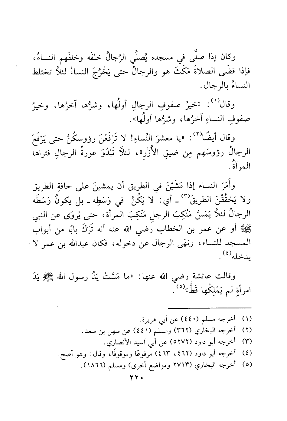 وكان إذا صلى في مسجده يُصلِّي الرِّجالُ خلفَه وخلفَهم النساءُ، فإذا قضَى الصلاةَ مَكَثَ هو والرجالُ حتى يَخْرُجَ النساءُ لئلاَّ تختلط النساءُ بالرجال.