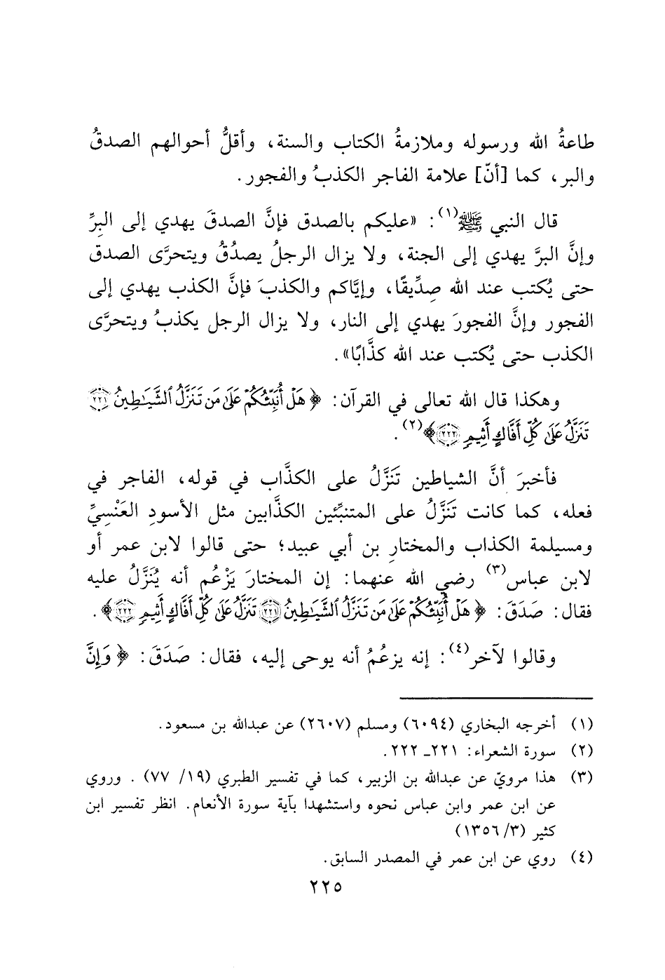 فأخبرَ أنَّ الشياطين تنَزَّلُ على الكذَّاب في قوله، الفاجر في فعله، كما كانت تنَزَّلُ على المتنبِّئين الكذَّابين مثل الأسودِ العَنْسِيِّ ومسيلمة الكذاب والمختارِ بن أبي عبيد؛ حتى قالوا لابن عمر أو لابن عباس (3) رضى الله عنهما: إن المختارَ يَزْعُم أنه يُنَزَّلُ عليه فقال: صَدَقَ: (هَلْ أُنَبِّئُكُمْ عَلَى مَنْ تَنَزَّلُ الشَّيَاطِينُ (221) تَنَزَّلُ عَلَى كُلِّ أَفَّاكٍ أَثِيمٍ (222)).