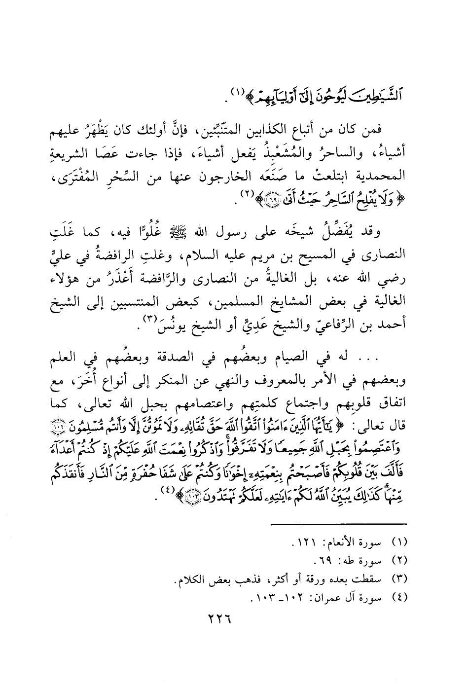 وقد يُفَضِّلُ شيخَه على رسول الله - صَلَّى اللَّهُ عَلَيْهِ وَسَلَّمَ - غُلُوًّا فيه، كما غَلَتِ النصارى في المسيح بن مريم عليه السلام، وغلتِ الرافضةُ في عليٍّ رضي الله عنه، بل الغاليةُ من النصارى والرَّافضة أَعْذَرُ من هؤلاء الغالية في بعض المشايخ المسلمين، كبعض المنتسبين إلى الشيخ أحمد بن الرِّفاعيّ والشيخ عَدِيٍّ أو الشيخ يونُسَ (3).