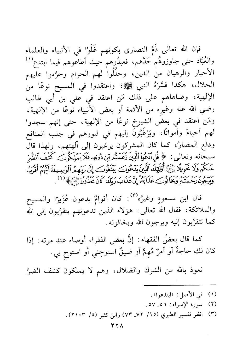 فإن الله تعالى ذَمَّ النصارى بكونهم غَلَوْا في الأنبياء والعلماء والعُبَّاد حتى جاوزوهُم حَدَّهم، فعبدُوهم حيث أطاعوهم فيما ابتدع (1) الأحبار والرهبان من الدين، وحللُوا لهم الحرام وحرَّموا عليهم الحلال، هكذا فسَّرَهُ النبي - صَلَّى اللَّهُ عَلَيْهِ وَسَلَّمَ -؛ واعتقدوا في المسيح نوعًا من الإلهية، وضاهاهم على ذلك مَن اعتقد في علي بن أبي طالب رضي الله عنه وغيرِه من الأئمة أو بعض الأنبياء نوعًا من الإلهية، ومَن اعتقد في بعض الشيوخ نوعًا من الإلهية، حتى إنهم سجدوا لهم أحياءً وأمواتًا، ويَرْغَبُونَ إليهم في قبورهم في جلب المنافع ودفع المضارِّ، كما كان المشرِكون يرغبون إلى آلهتهم، ولهذا قال سبحانه وتعالى: (قُلِ ادْعُوا الَّذِينَ زَعَمْتُمْ مِنْ دُونِهِ فَلَا يَمْلِكُونَ كَشْفَ الضُّرِّ عَنْكُمْ وَلَا تَحْوِيلًا (56) أُولَئِكَ الَّذِينَ يَدْعُونَ يَبْتَغُونَ إِلَى رَبِّهِمُ الْوَسِيلَةَ أَيُّهُمْ أَقْرَبُ وَيَرْجُونَ رَحْمَتَهُ وَيَخَافُونَ عَذَابَهُ إِنَّ عَذَابَ رَبِّكَ كَانَ مَحْذُورًا (57)) (2).
