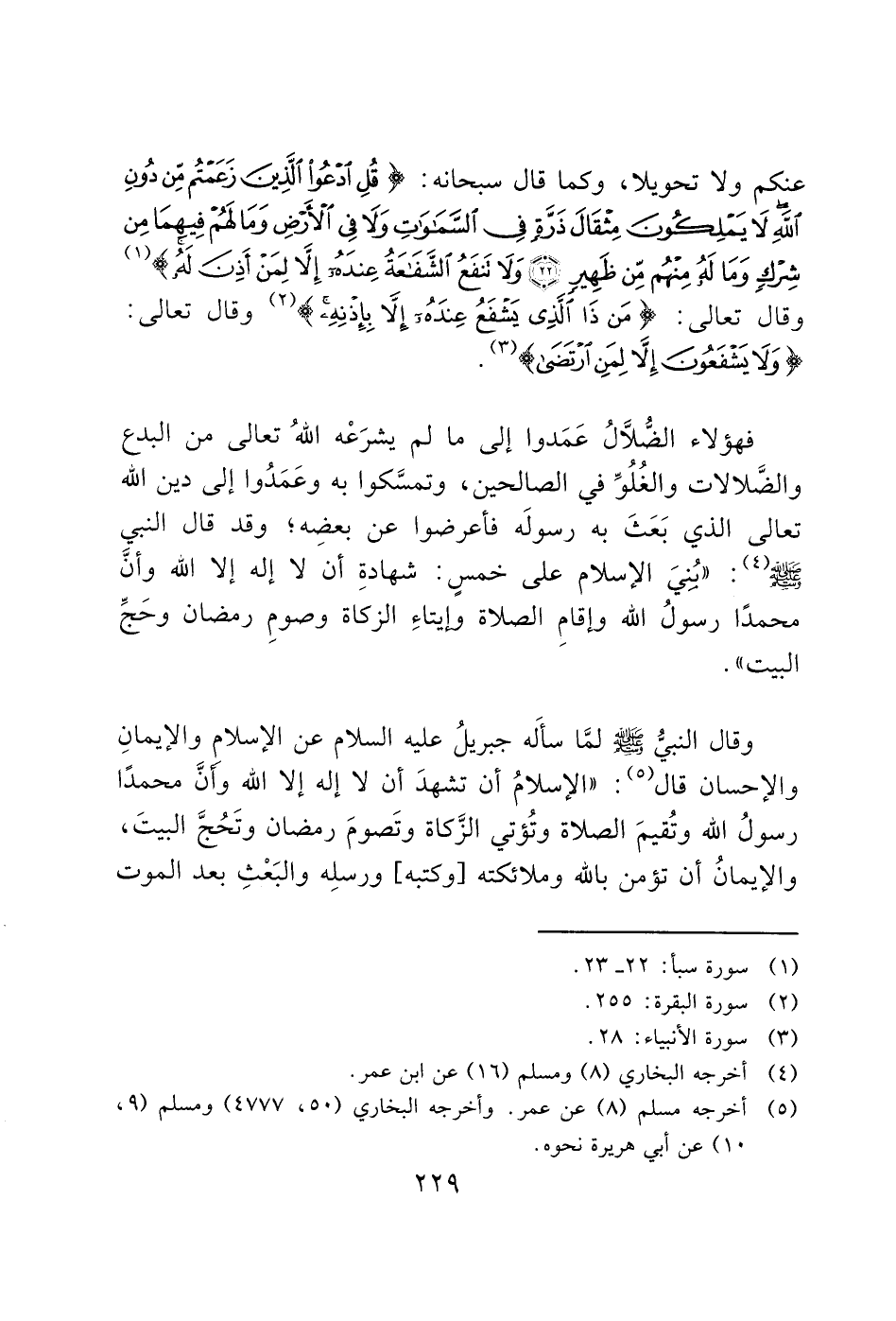 وقال النبيُّ - صَلَّى اللَّهُ عَلَيْهِ وَسَلَّمَ - لمَّا سأَله جبريلُ عليه السلام عن الإسلام والإيمانِ والإحسان قال (5): "الإسلامُ أن تشهدَ أن لا إله إلا الله وإنَّ محمدًا رسولُ الله وتُقيمَ الصلاة وتُؤتي الزَّكاة وتَصومَ رمضان وتَحُجَّ البيتَ، والإيمانُ أن تؤمن بالله وملائكته [وكتبه] ورسلِه والبَعْثِ بعد الموت