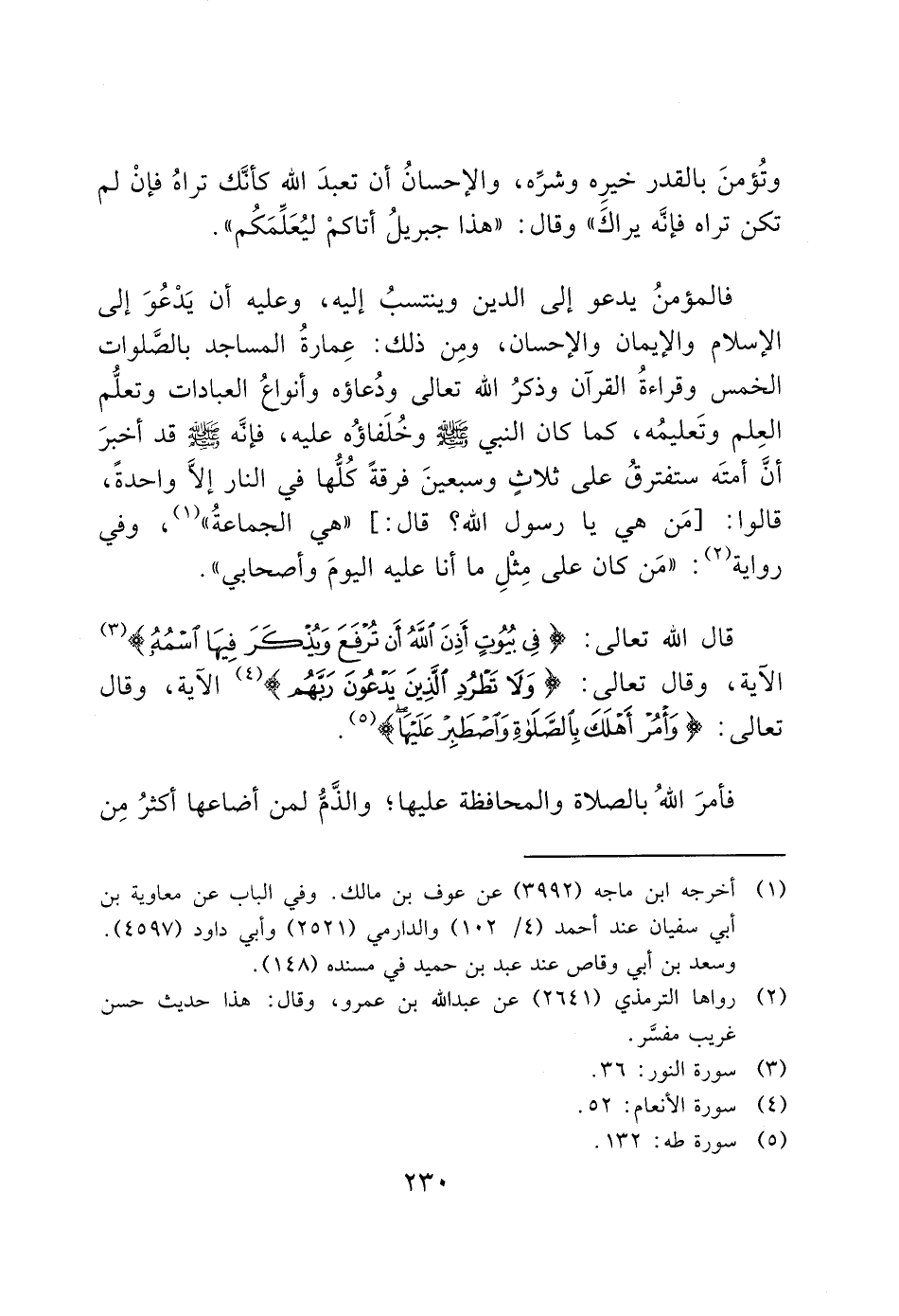 فالمؤمنُ يدعو إلى الدين وينتسبُ إليه، وعليه أن يَدْعُوَ إلى الإسلام والإيمان والإحسان، ومِن ذلك: عِمارةُ المساجد بالصَّلوات الخمس وقراءةُ القرآن وذكرُ الله تعالى ودُعاؤه وأنواعُ العبادات وتعلُّم العِلم وتَعليمُه، كما كان النبي - صَلَّى اللَّهُ عَلَيْهِ وَسَلَّمَ - وخُلَفاؤُه عليه، فإنَّه - صَلَّى اللَّهُ عَلَيْهِ وَسَلَّمَ - قد أخبرَ أنَ أمتَه ستفترقُ على ثلاثٍ وسبعينَ فرقةً كُلُّها في النار إلا واحدةً، قالوا: [مَن هي يا رسول الله؟ قال:] "هي الجماعةُ" (1)، وفي رواية (2): "مَن كان على مِثْلِ ما أنا عليه اليومَ وأصحابي".