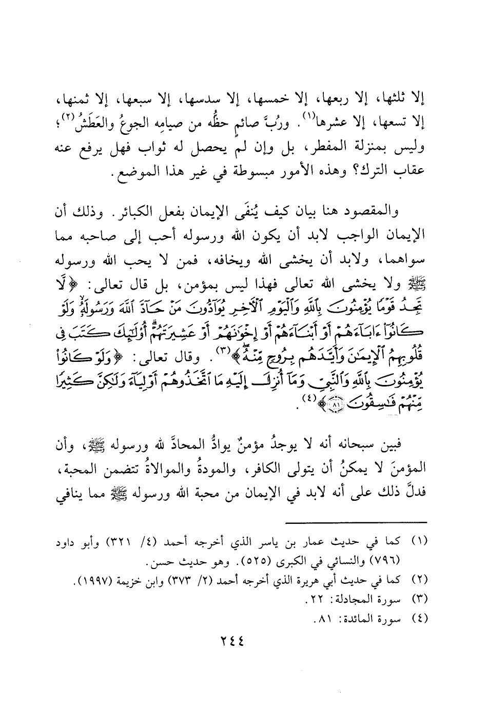 والمقصود هنا بيان كيف يُنفَى الإيمان بفعل الكبائر. وذلك أن الإيمان الواجب لابد أن يكون الله ورسوله أحب إلى صاحبه مما سواهما، ولابد أن يخشى الله ويخافه، فمن لا يحب الله ورسوله - صَلَّى اللَّهُ عَلَيْهِ وَسَلَّمَ - ولا يخشى الله تعالى فهذا ليس بمؤمن، بل قال تعالى: (لَا تَجِدُ قَوْمًا يُؤْمِنُونَ بِاللَّهِ وَالْيَوْمِ الْآَخِرِ يُوَادُّونَ مَنْ حَادَّ اللَّهَ وَرَسُولَهُ وَلَوْ كَانُوا آَبَاءَهُمْ أَوْ أَبْنَاءَهُمْ أَوْ إِخْوَانَهُمْ أَوْ عَشِيرَتَهُمْ أُولَئِكَ كَتَبَ فِي قُلُوبِهِمُ الْإِيمَانَ وَأَيَّدَهُمْ بِرُوحٍ مِنْهُ) (3). وقال تعالى: (وَلَوْ كَانُوا يُؤْمِنُونَ بِاللَّهِ وَالنَّبِيِّ وَمَا أُنْزِلَ إِلَيْهِ مَا اتَّخَذُوهُمْ أَوْلِيَاءَ وَلَكِنَّ كَثِيرًا مِنْهُمْ فَاسِقُونَ (81)) (4).