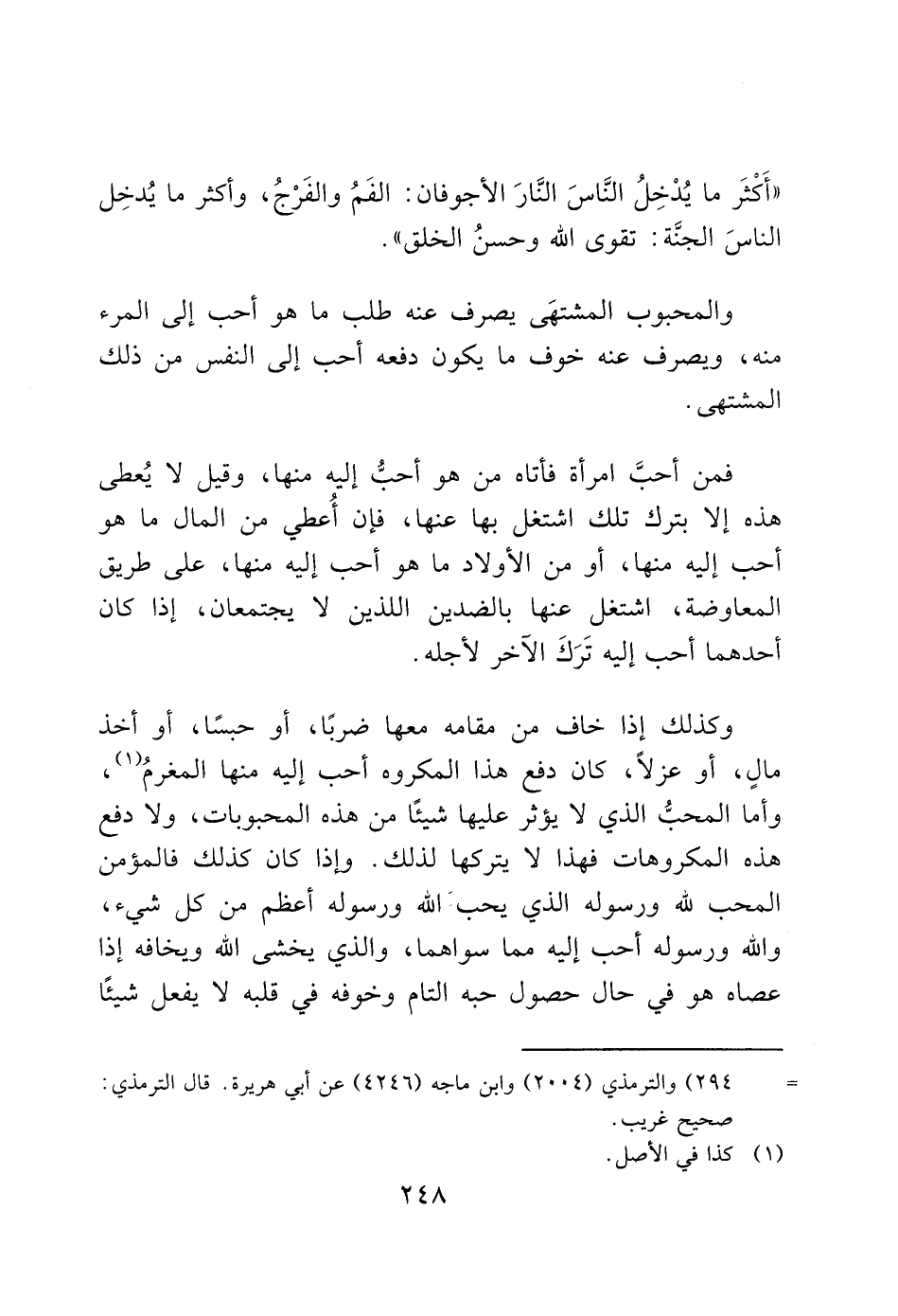 "أَكْثَر ما يُدْخِلُ النَّاسَ النَّارَ الأجوفان: الفَمُ والفَرْجُ، وأكثر ما يُدخِل الناسَ الجنَّة: تقوى الله وحسنُ الخلق".