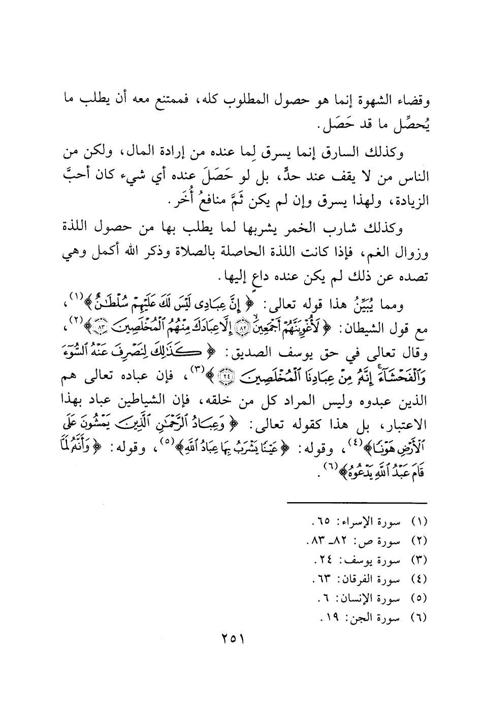 ومما يُبيِّنُ هذا قوله تعالى: (إِنَّ عِبَادِي لَيْسَ لَكَ عَلَيْهِمْ سُلْطَانٌ) (1)، مع قول الشيطان: (لَأُغْوِيَنَّهُمْ أَجْمَعِينَ (82) إِلَّا عِبَادَكَ مِنْهُمُ الْمُخْلَصِينَ (83)) (2)، وقال تعالى في حق يوسف الصديق: (كَذَلِكَ لِنَصْرِفَ عَنْهُ السُّوءَ وَالْفَحْشَاءَ إِنَّهُ مِنْ عِبَادِنَا الْمُخْلَصِينَ (24)) (3)، فإن عباده تعالى هم الذين عبدوه وليس المراد كل من خلقه، فإن الشياطين عباد بهذا الاعتبار، بل هذا كقوله تعالى: (وَعِبَادُ الرَّحْمَنِ الَّذِينَ يَمْشُونَ عَلَى الْأَرْضِ هَوْنًا) (4)، وقوله: (عَيْنًا يَشْرَبُ بِهَا عِبَادُ اللَّهِ) (5)، وقوله: (وَأَنَّهُ لَمَّا قَامَ عَبْدُ اللَّهِ يَدْعُوهُ) (6).